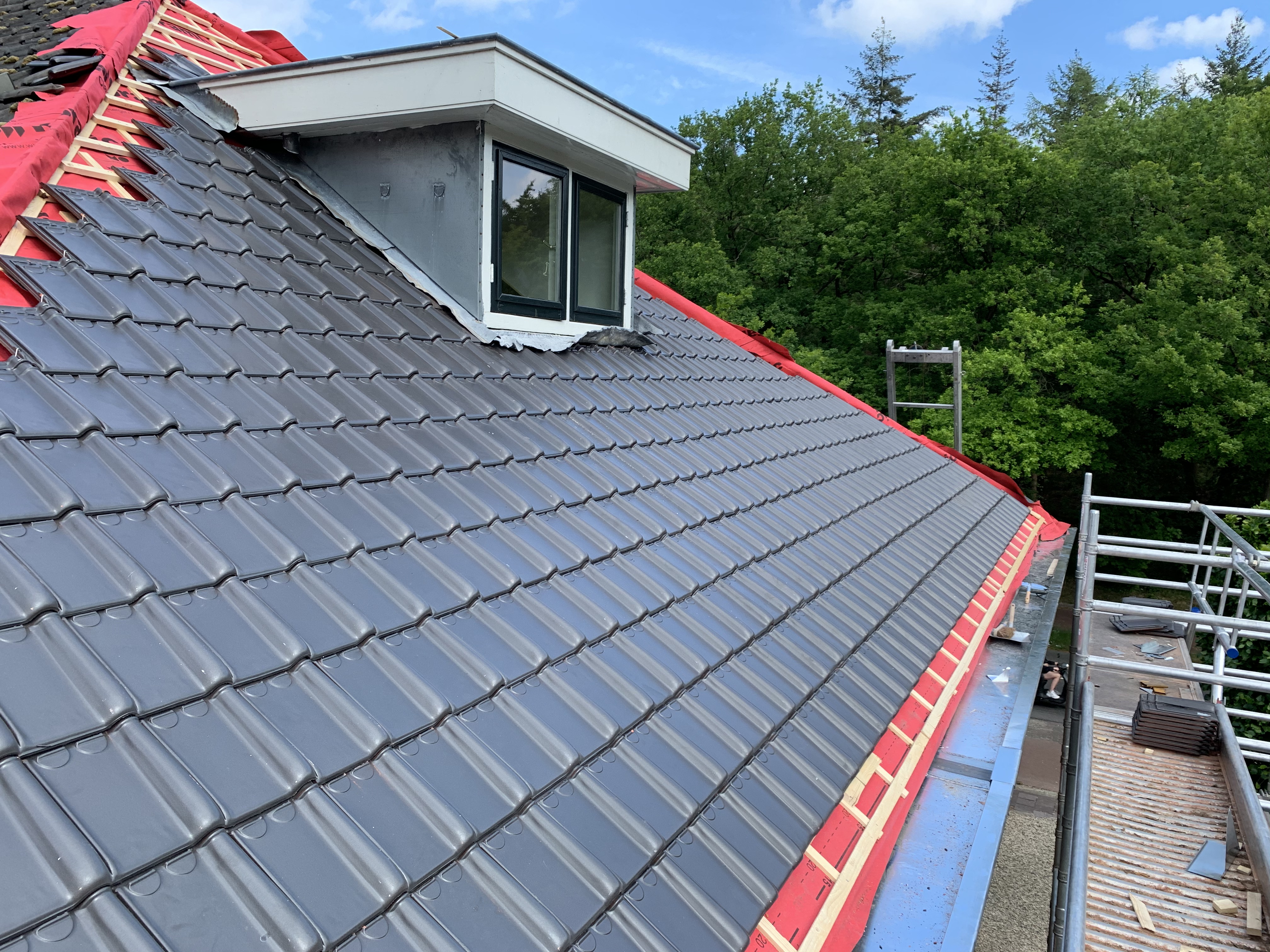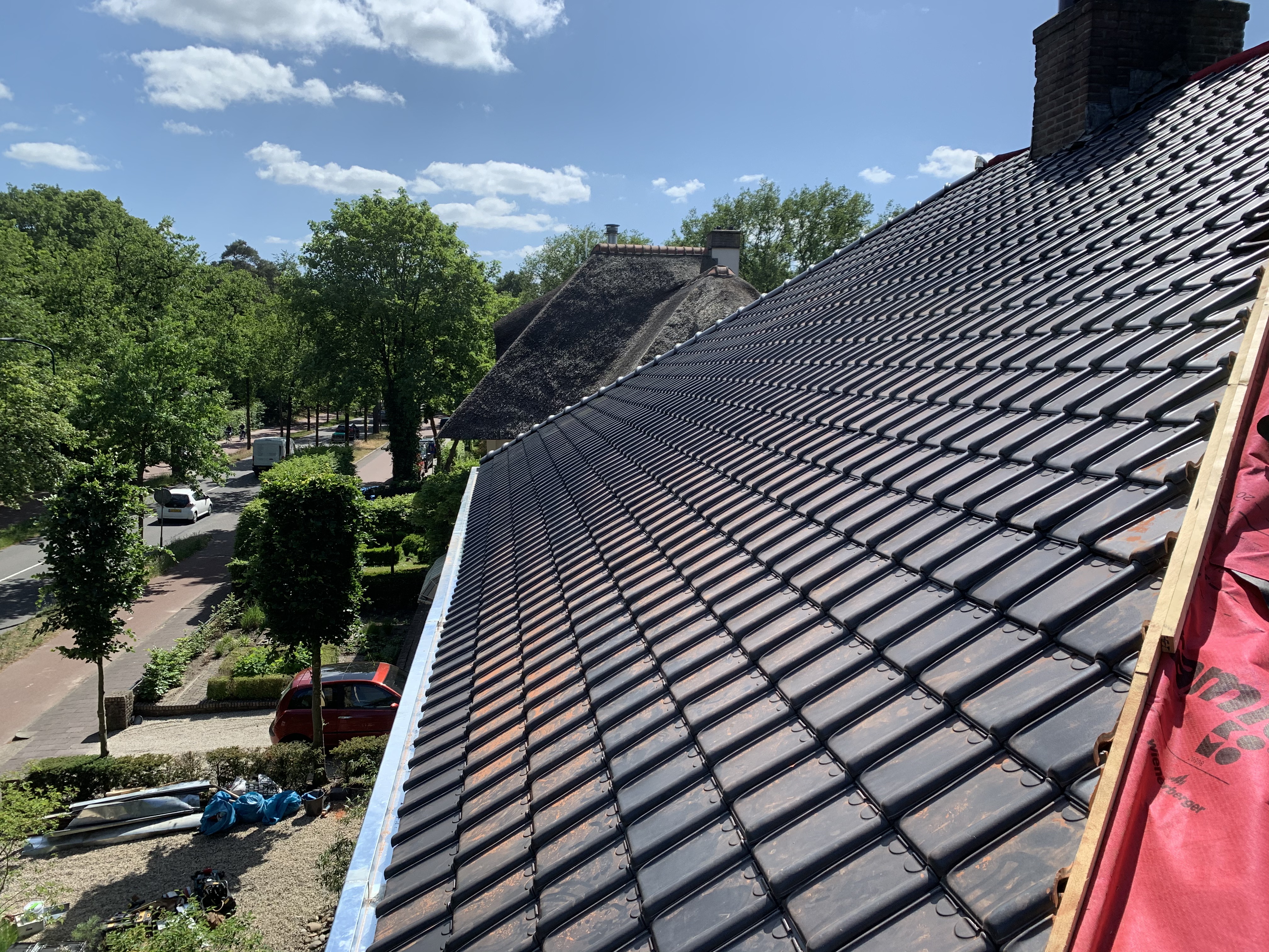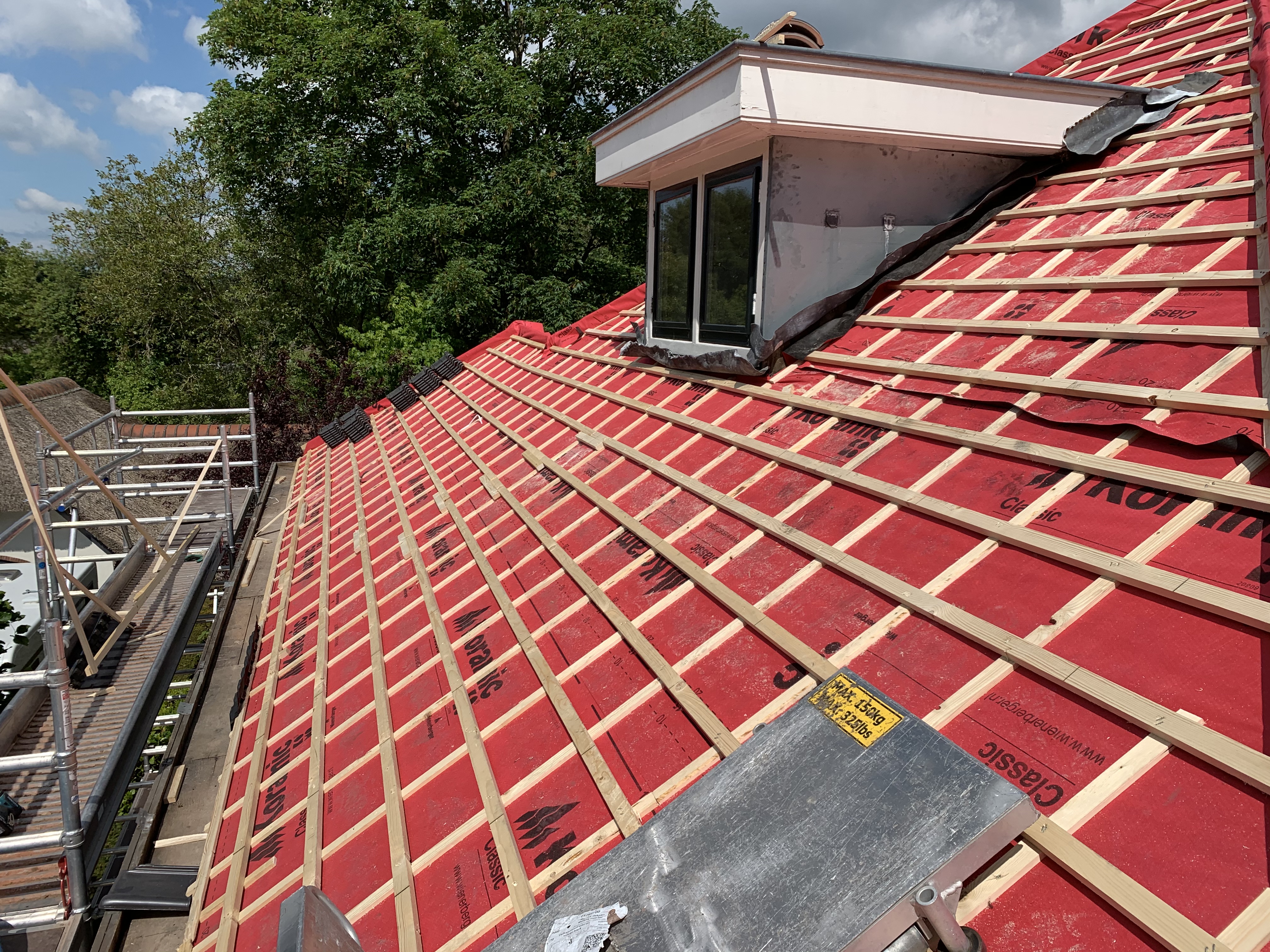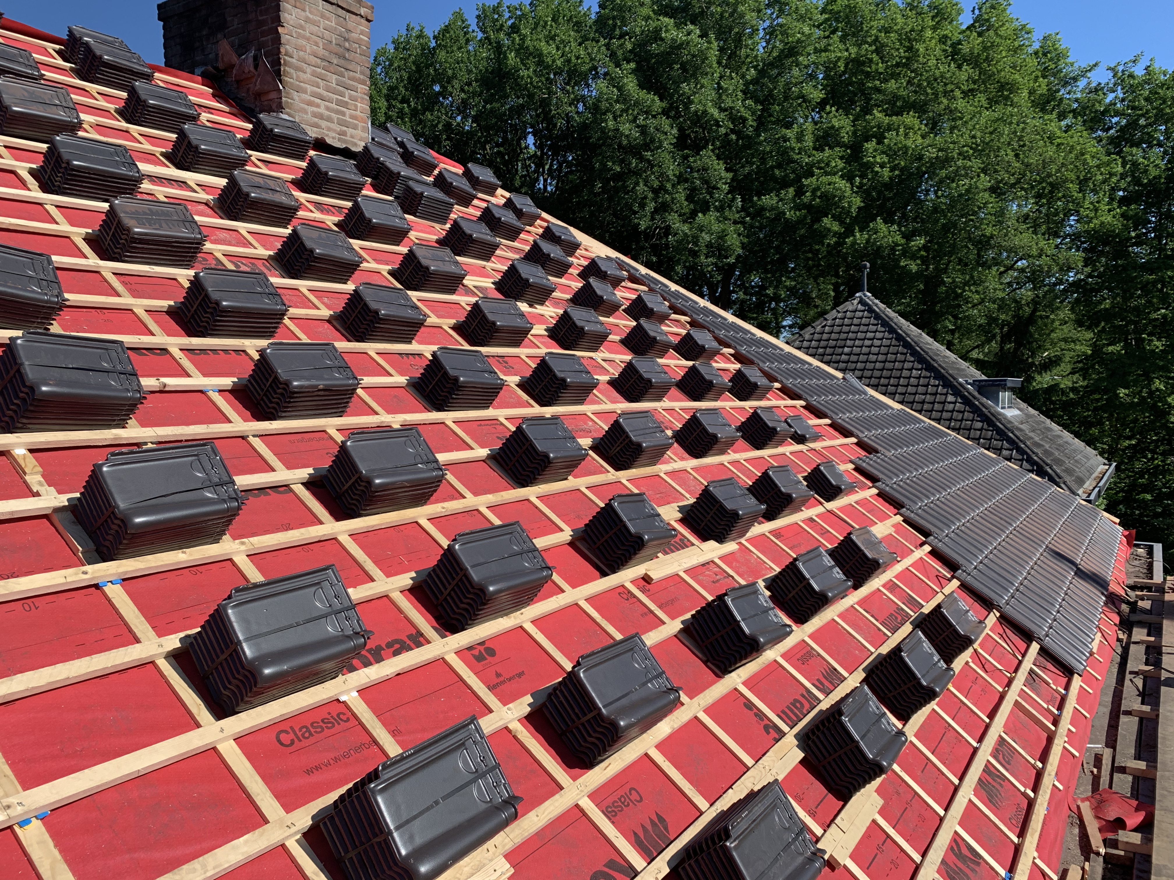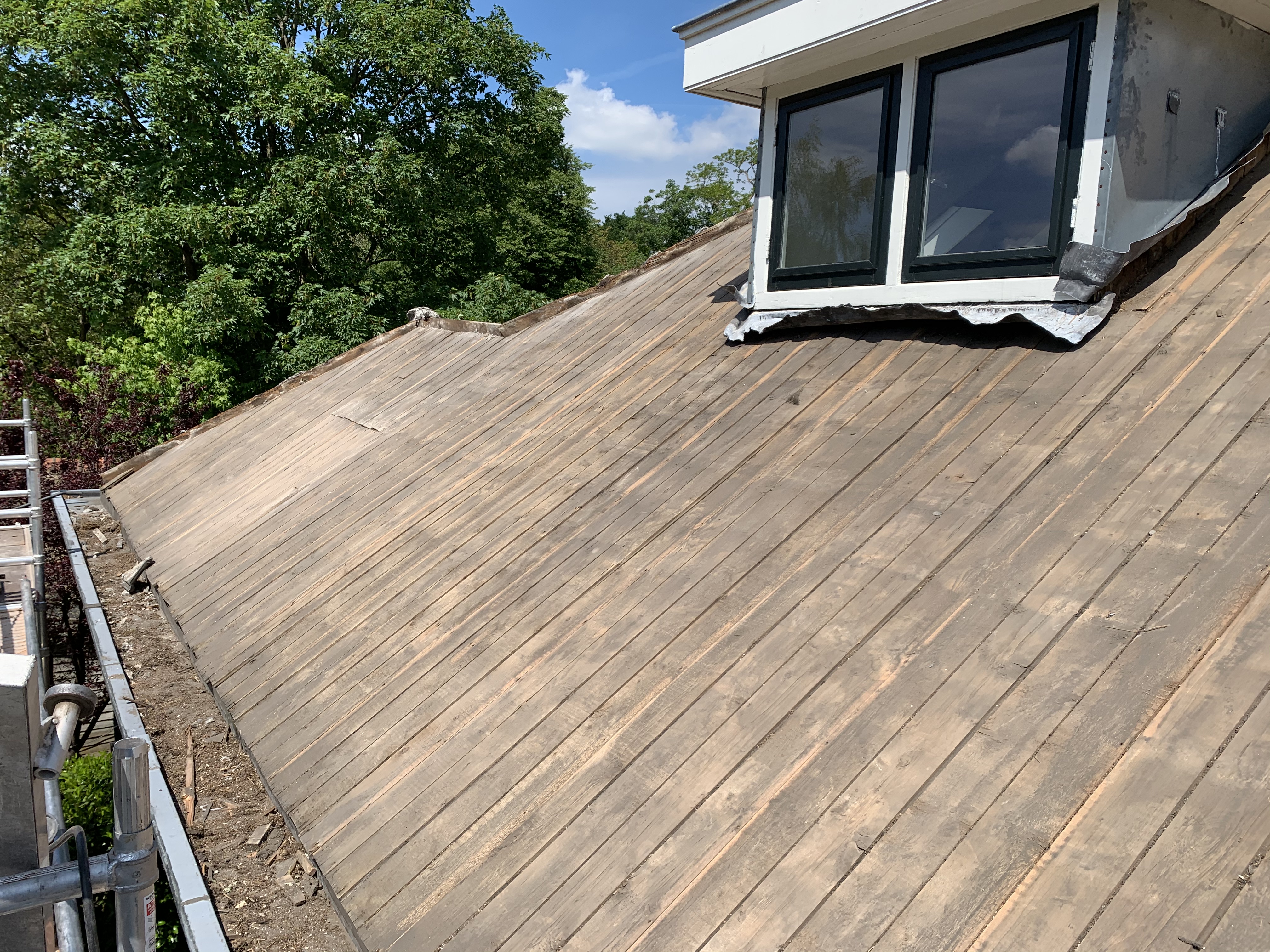 We hebben alle dakpannen, panlatten en tengels verwijderd. Waar nodig is het dakbeschot gerepareerd. Rondom zijn er nieuwe zinken dakgoten geplaatst alsook dampopen dakfolie.