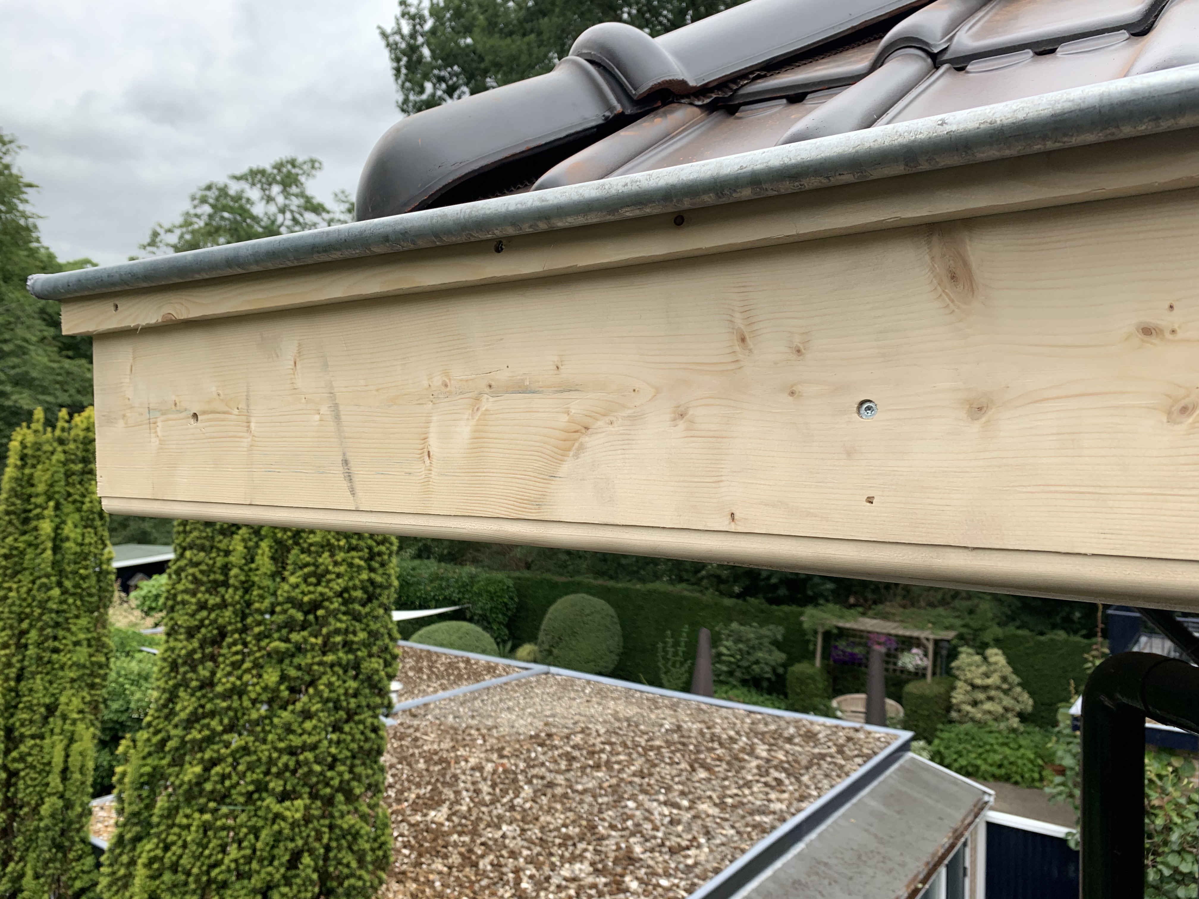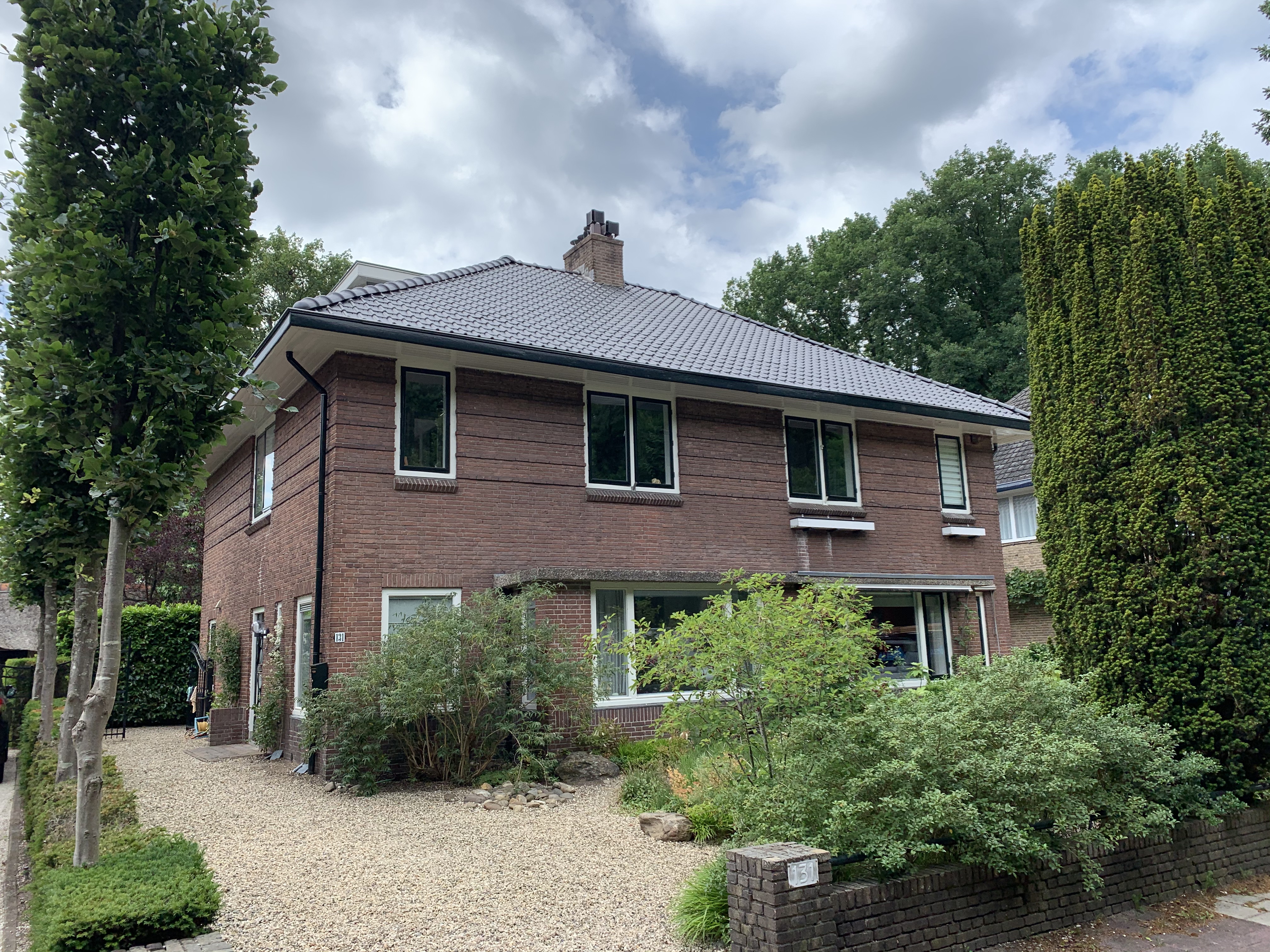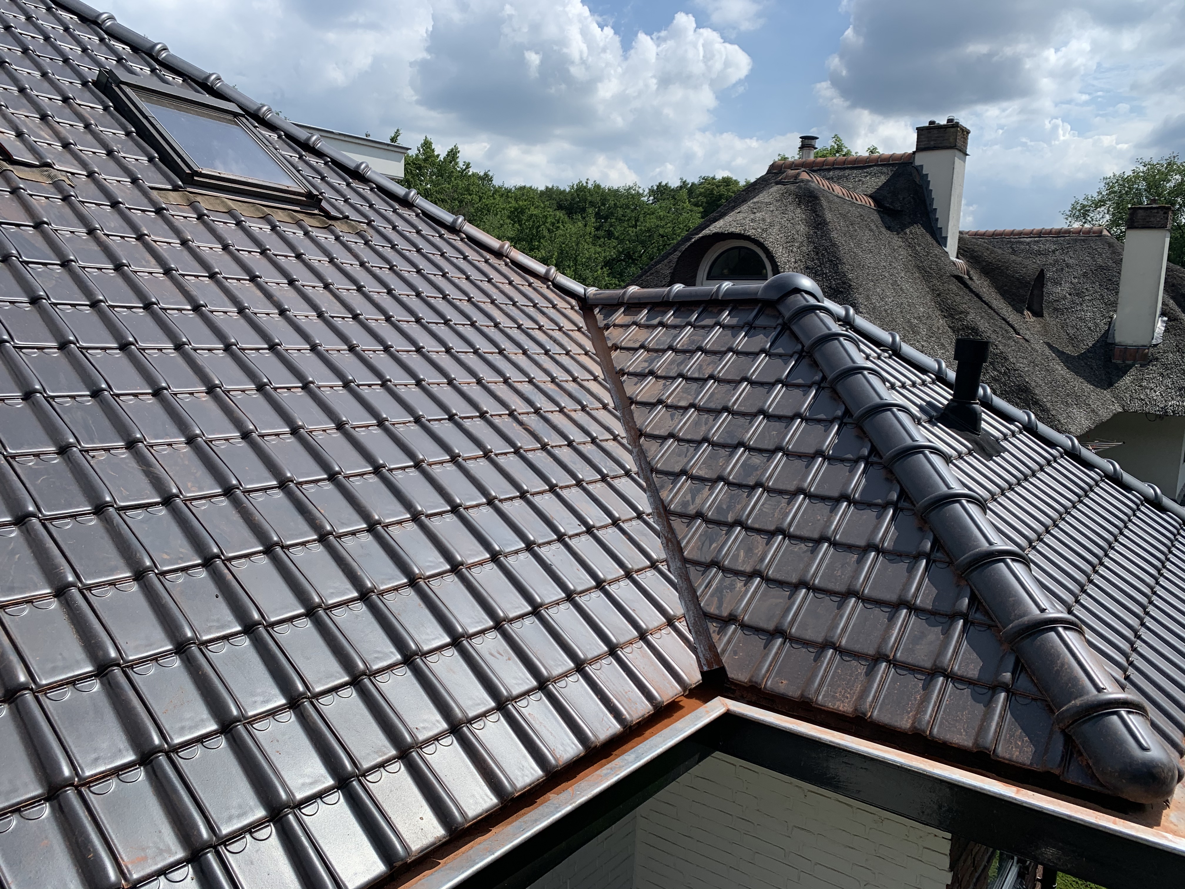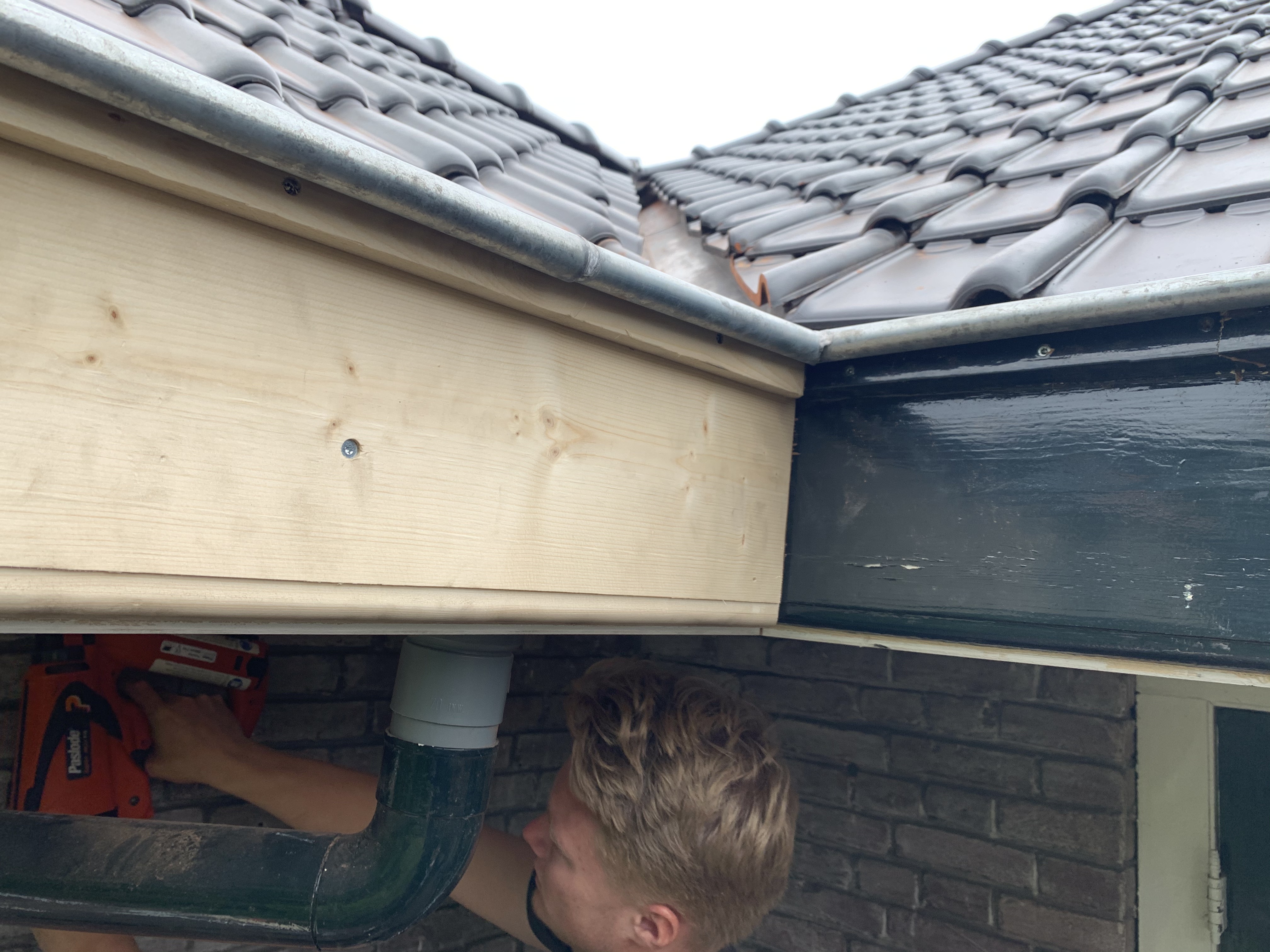 Aan de voorkant was het dak op sommige plekken flink doorgezakt (het oude dakbeschot van planken. Dit hebben we zo veel mogelijk uitgevlakt en er zijn weer mooie nieuwe keramische tuile du nord dakpannen van monier opgelegd. Op 1 plek hebben we de gootbetimmering moeten herstellen en hierin hebben we ook de mooie details gefreesd zoals het bedoeld was.