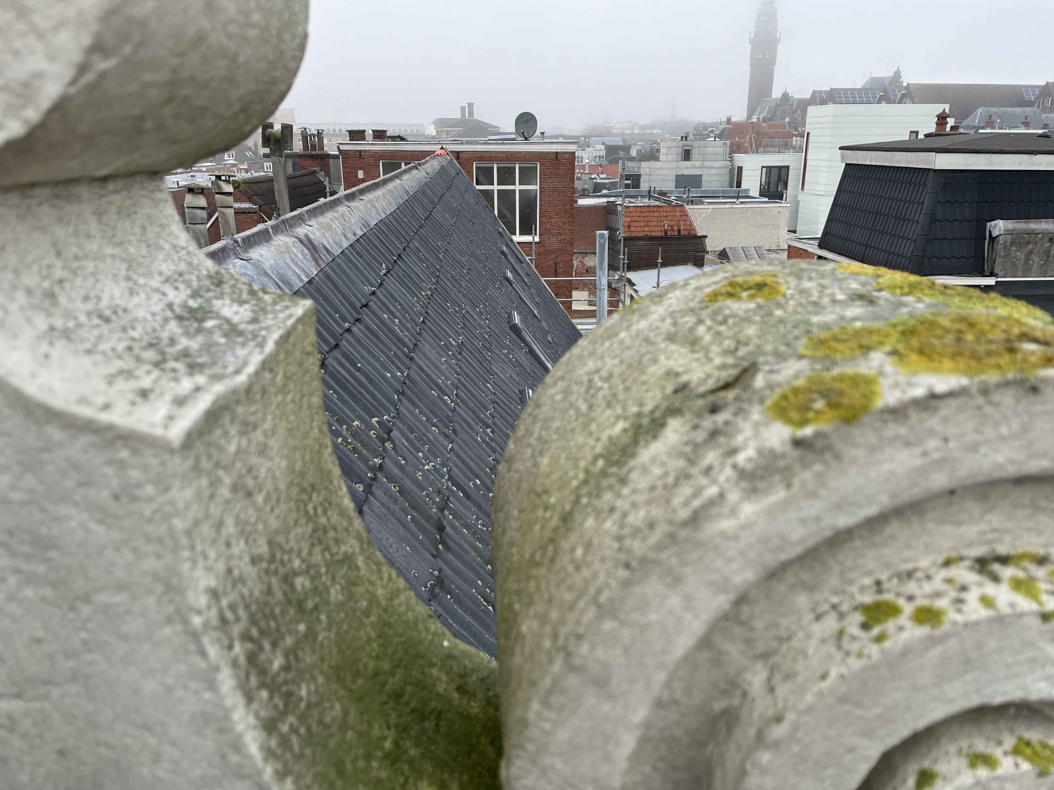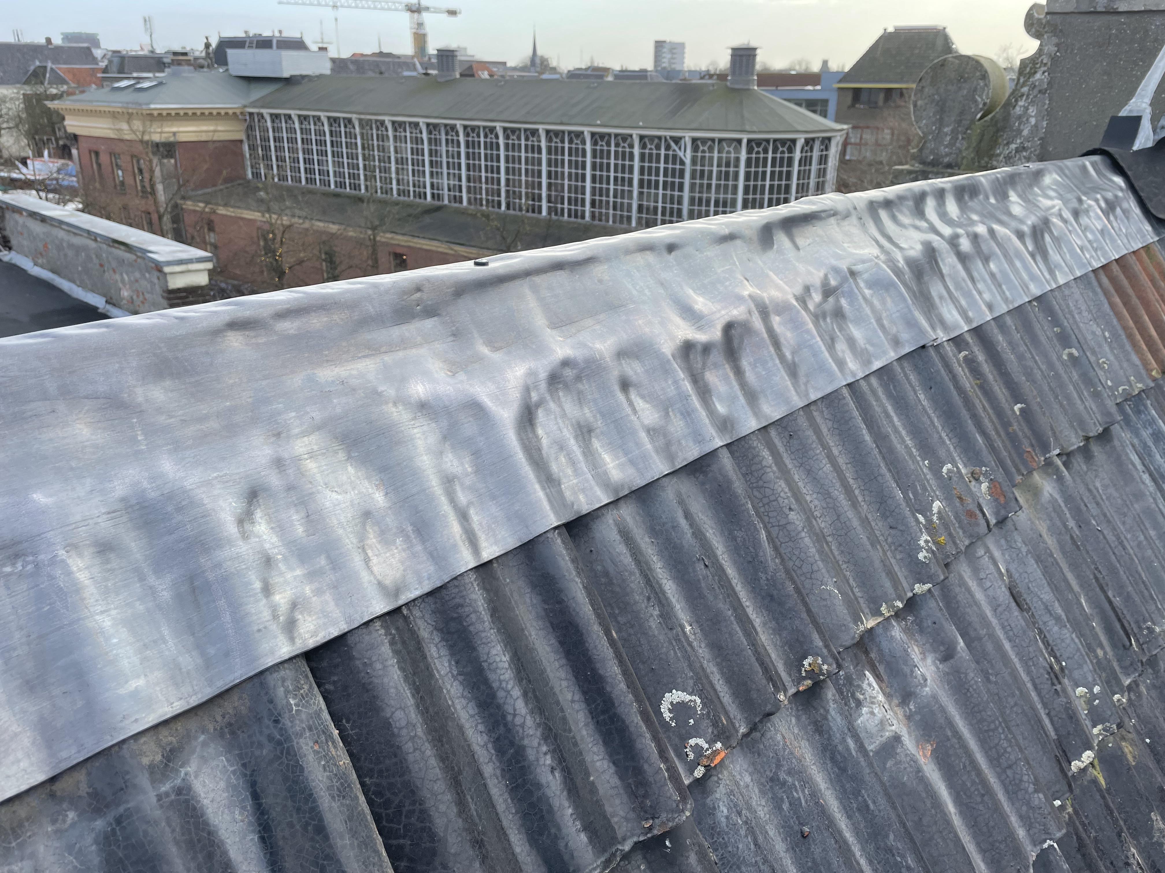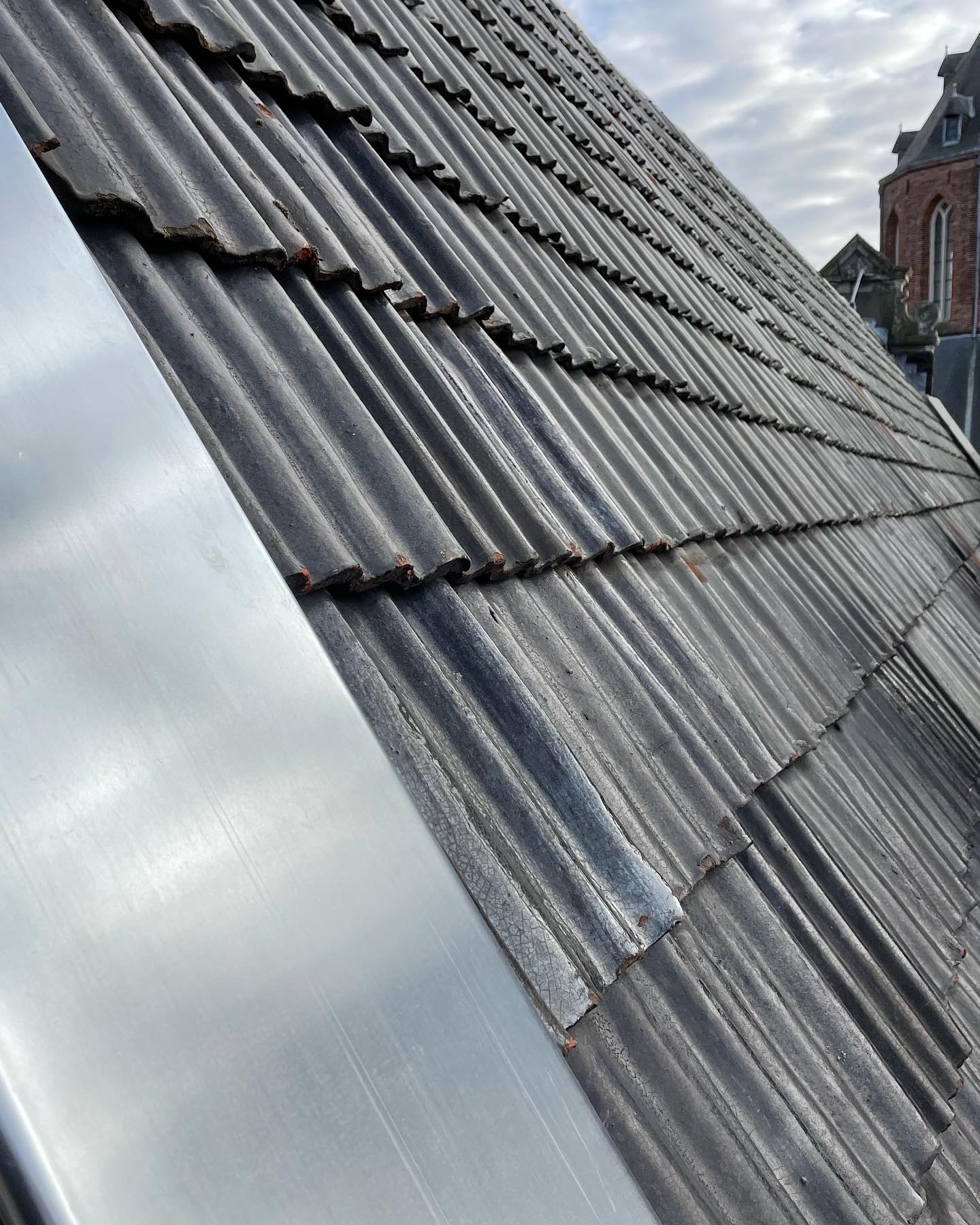 En dan de nieuwe dakpannen weer terug. Pannen van meer dan 150 jaar oud zijn niet altijd even maatvast maar wij redden ons daarmee.