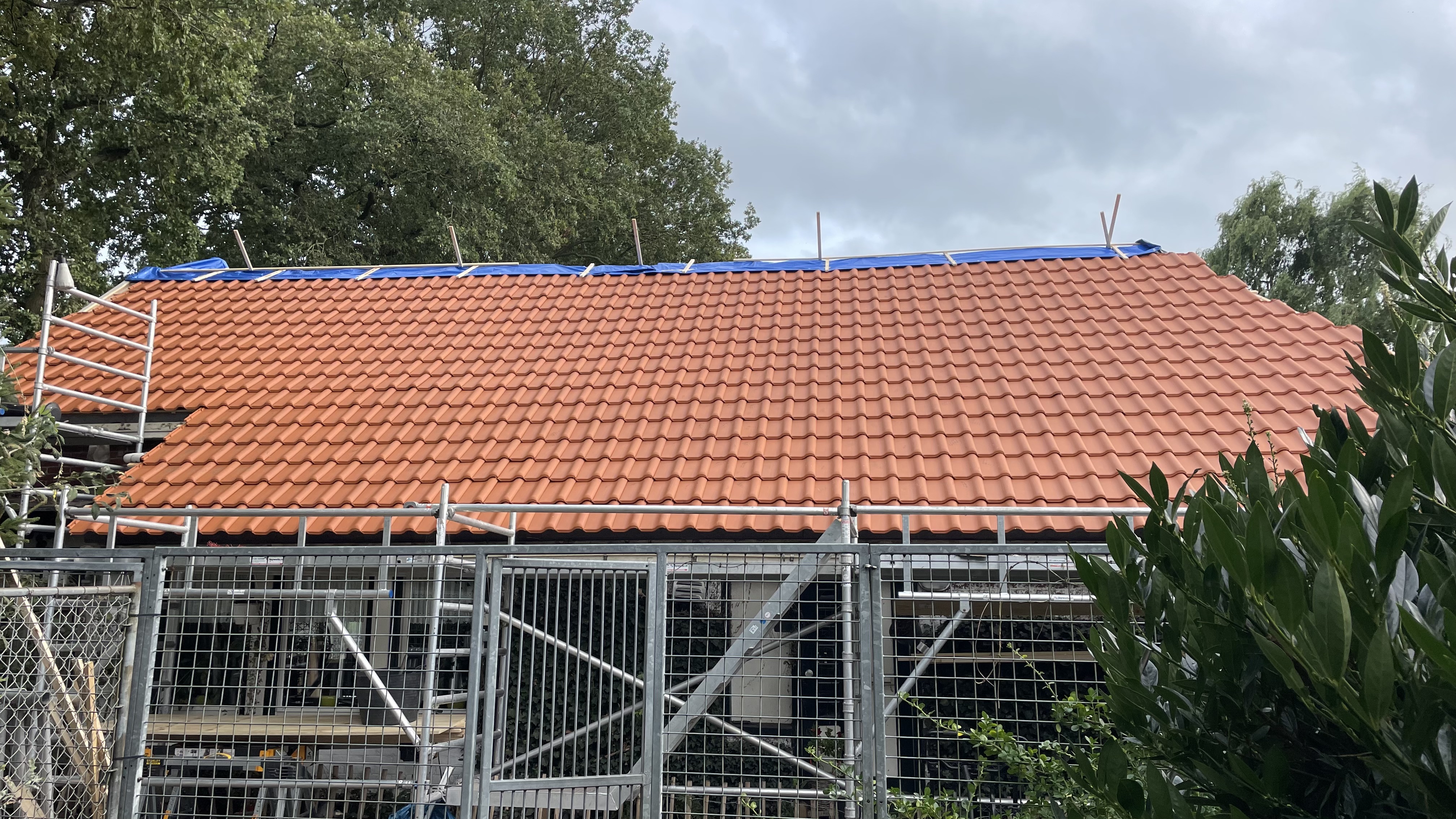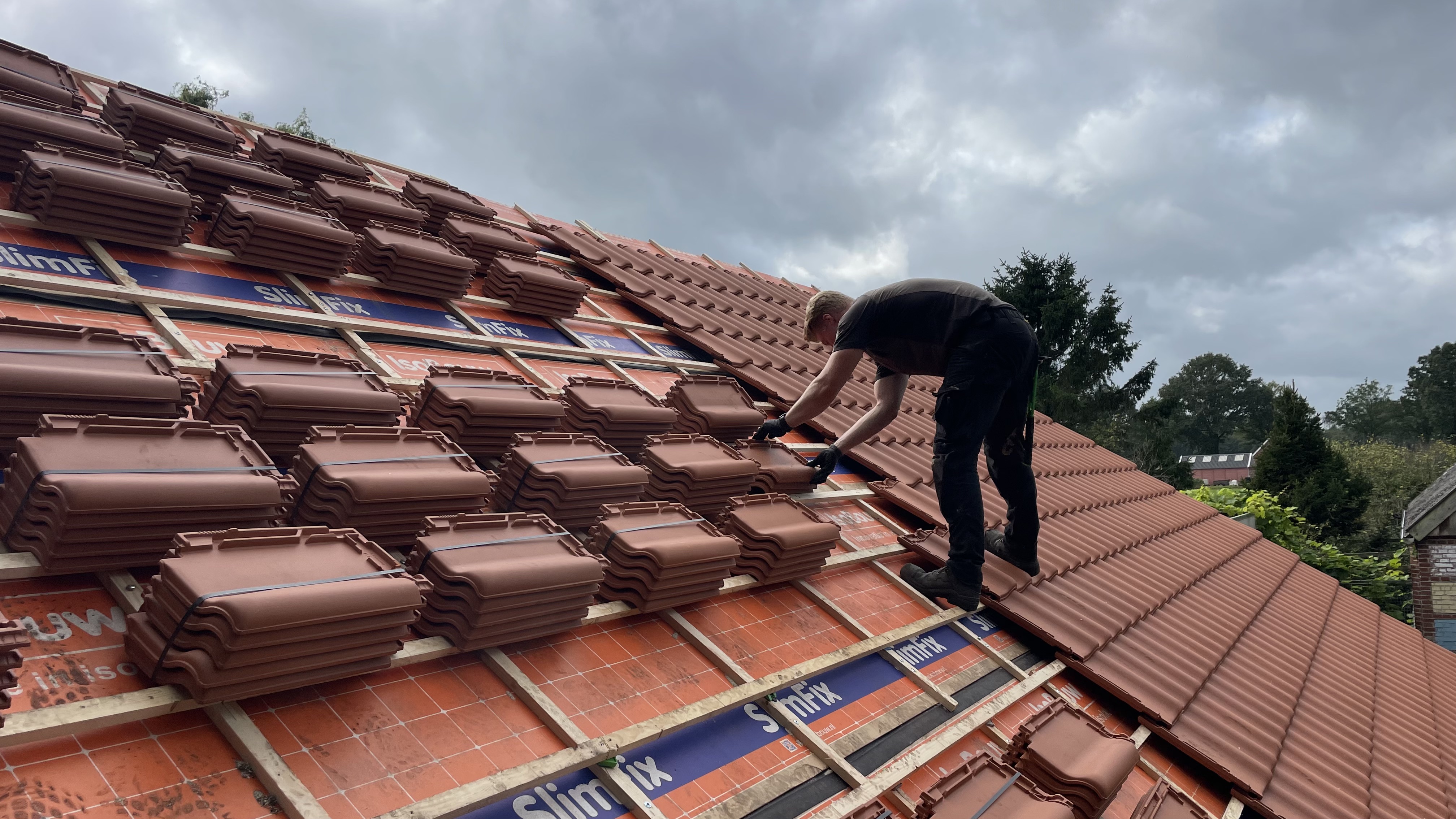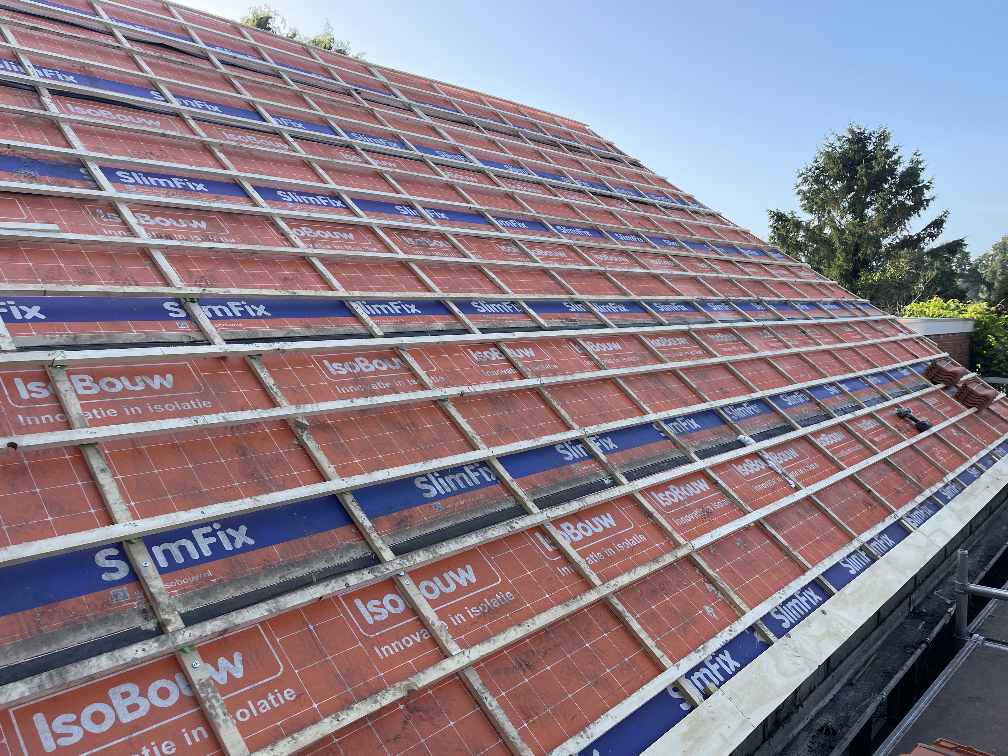 Vervolgens het hele dak geïsoleerd met Isobouw Slimfix spoor 4,5. en als dakpannen de natuurorde flachdachpan F10 van Nelskamp.