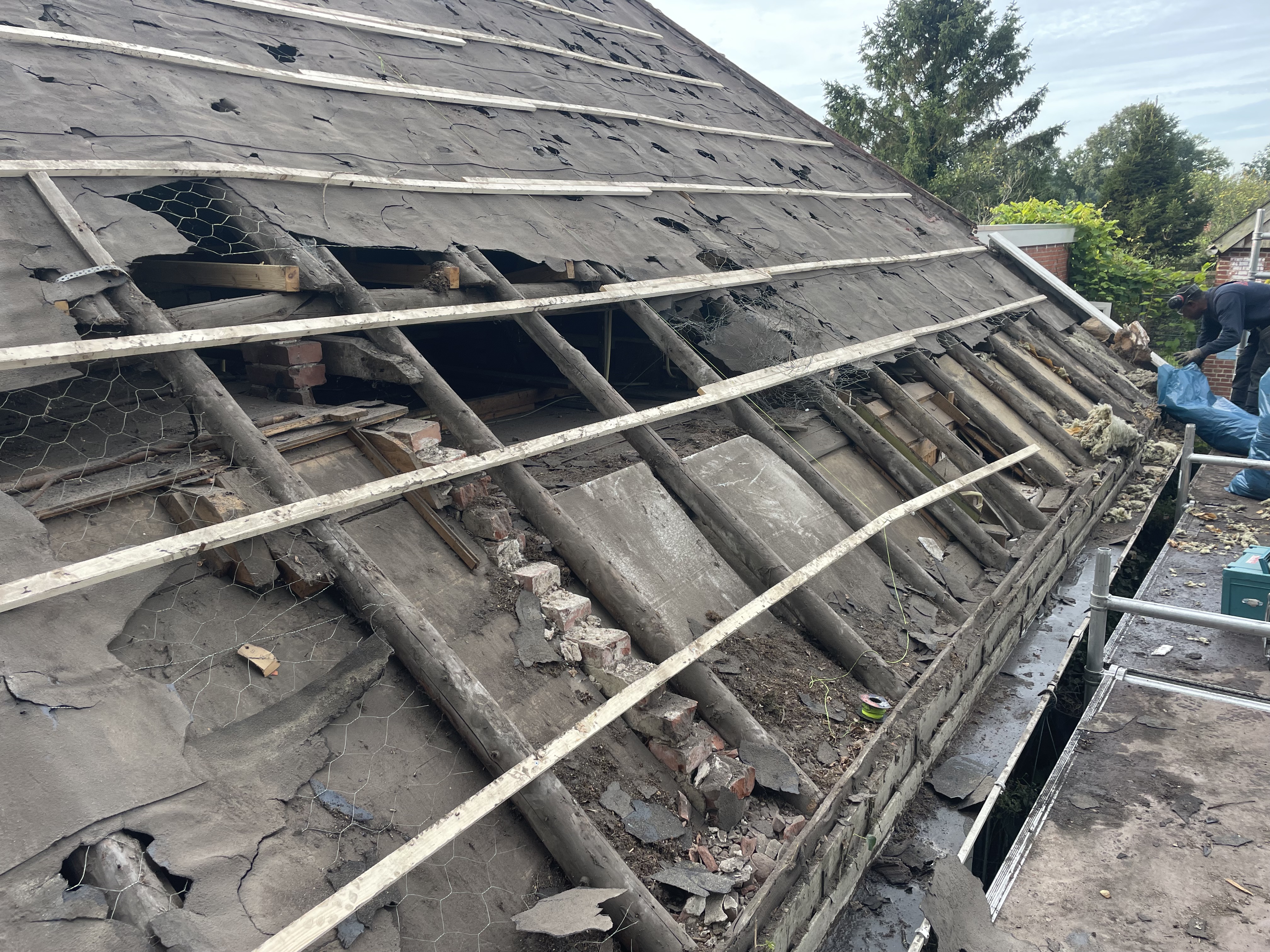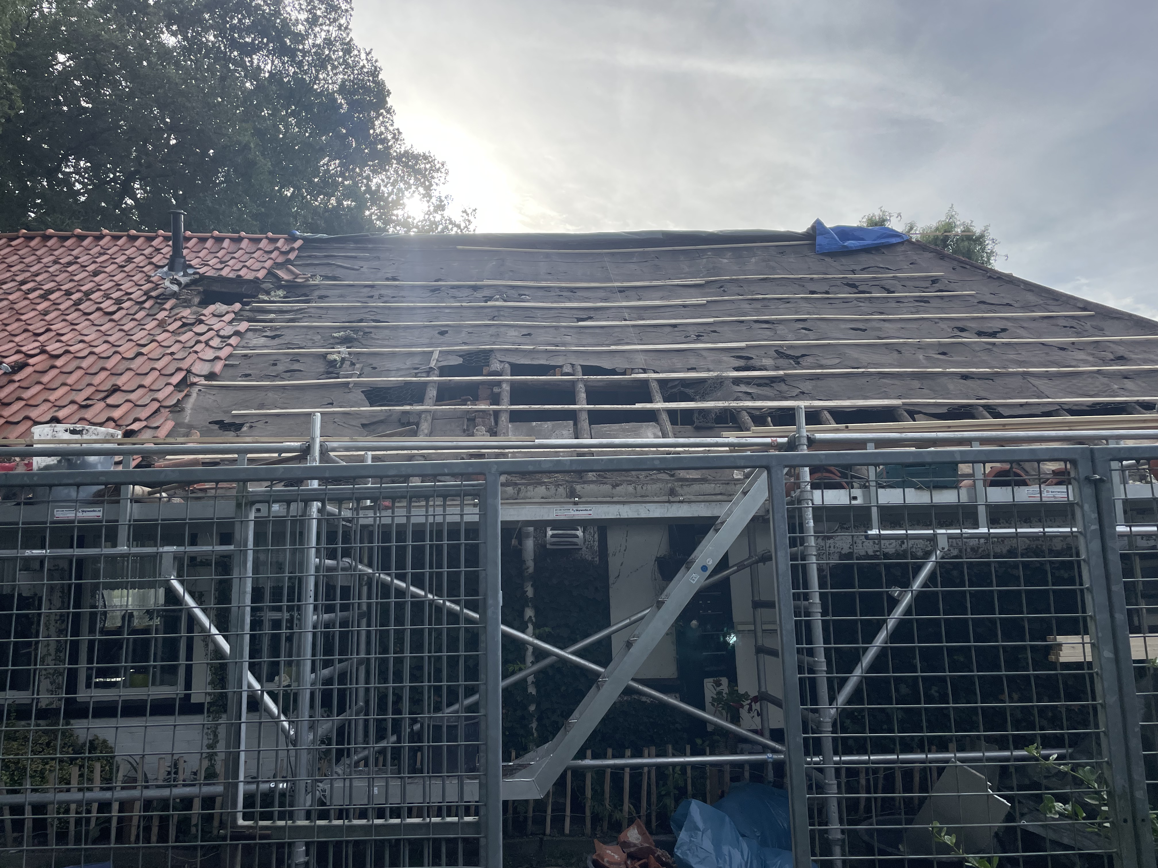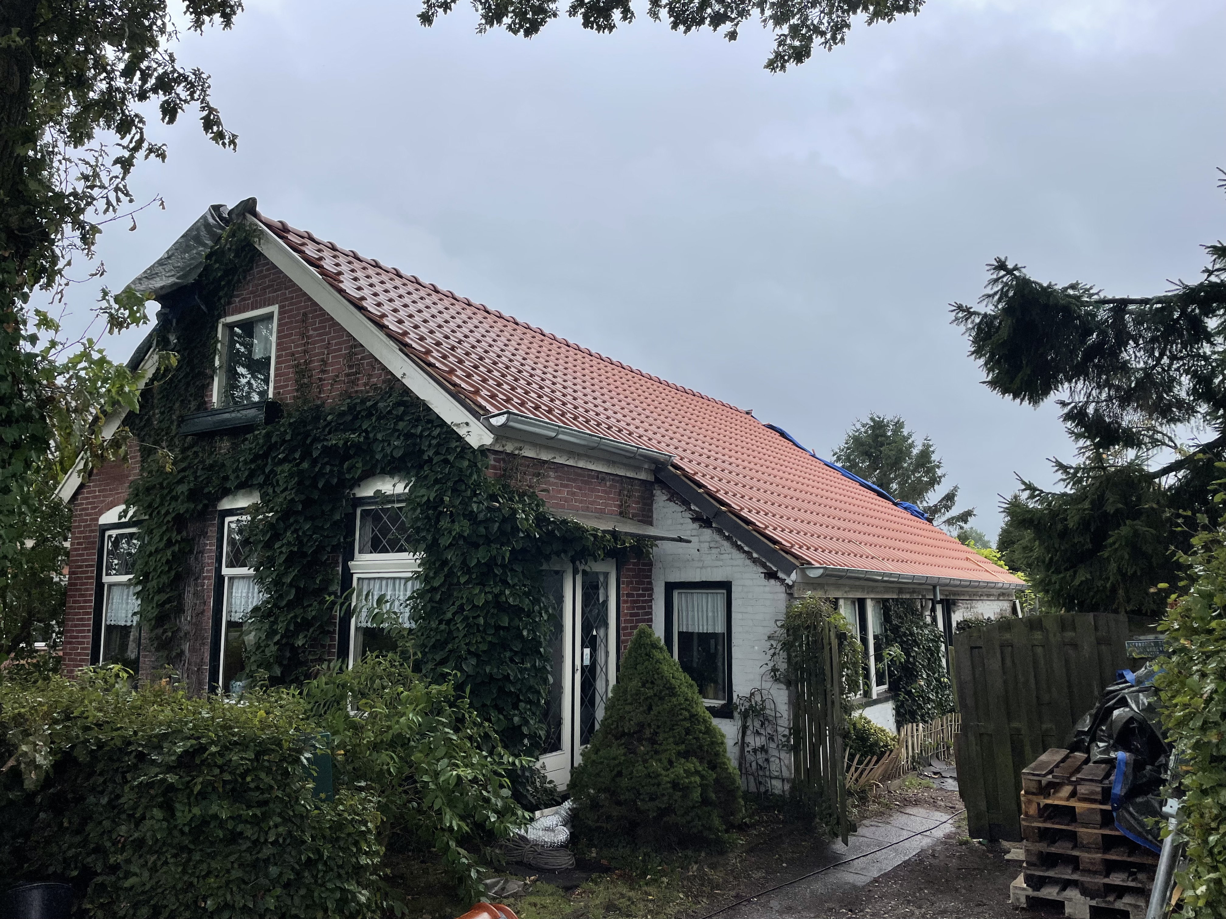 Vervolgens het hele dak geïsoleerd met Isobouw Slimfix spoor 4,5. en als dakpannen de natuurorde flachdachpan F10 van Nelskamp.