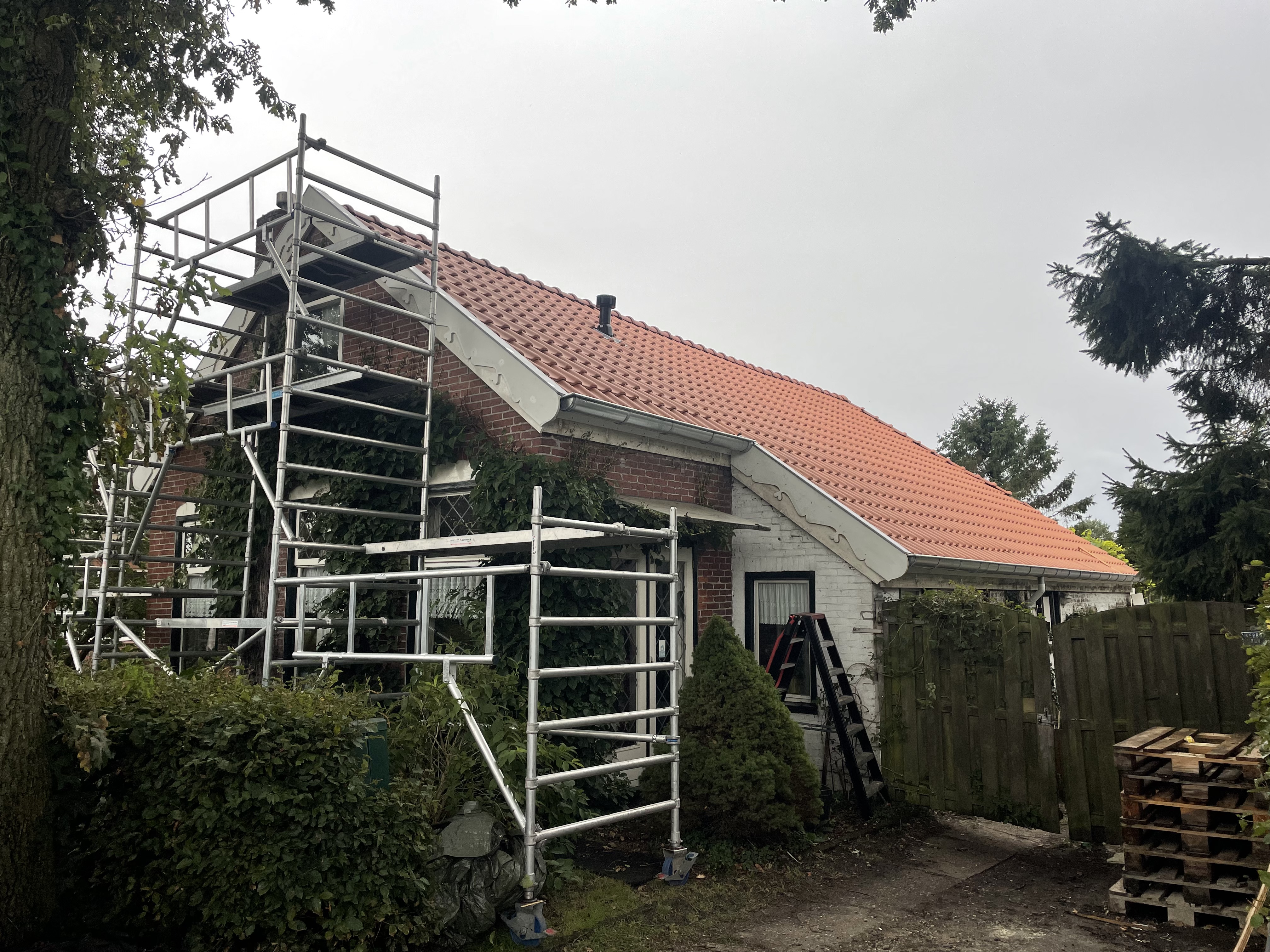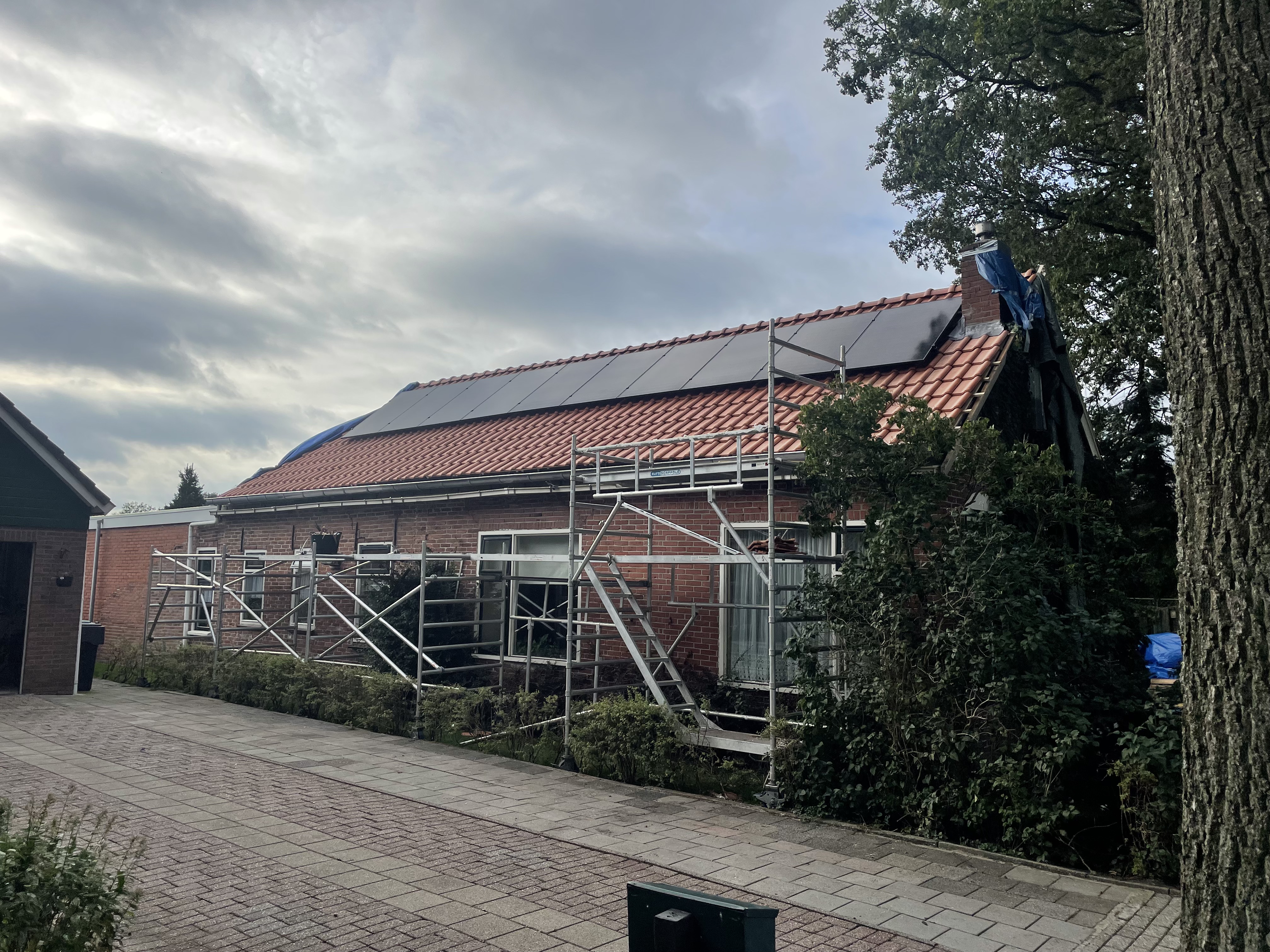 Ook is er weer een nieuwe zinken dakgoot geplaatst zoals het hoort. Speciaal op verzoek van de eigenaar zijn de boeidelen voorzien van een versiering. En, voor de toekomst ook 12 Zonnepanelen met totaal 4,8 KW geïnstalleerd vermogen.