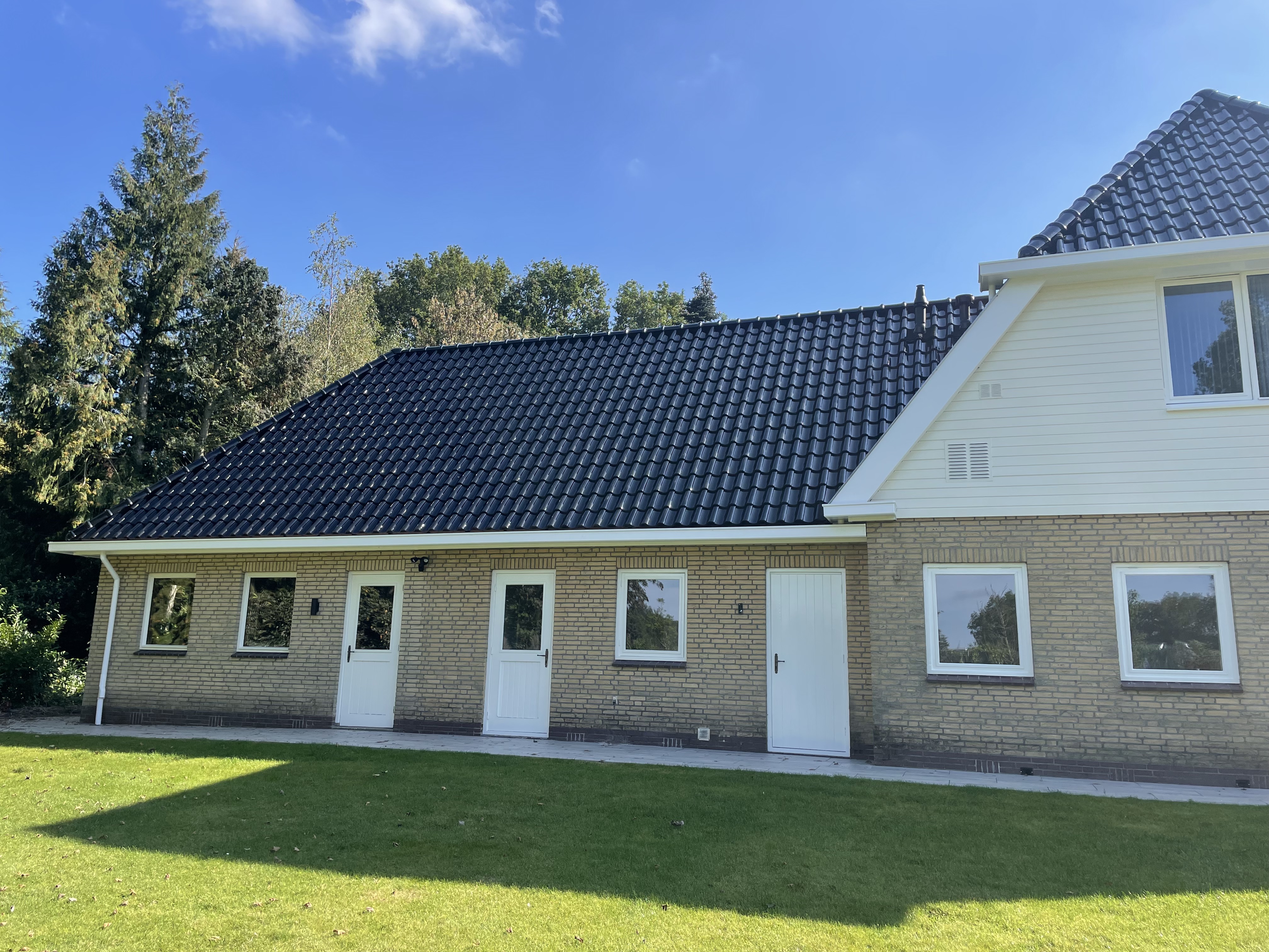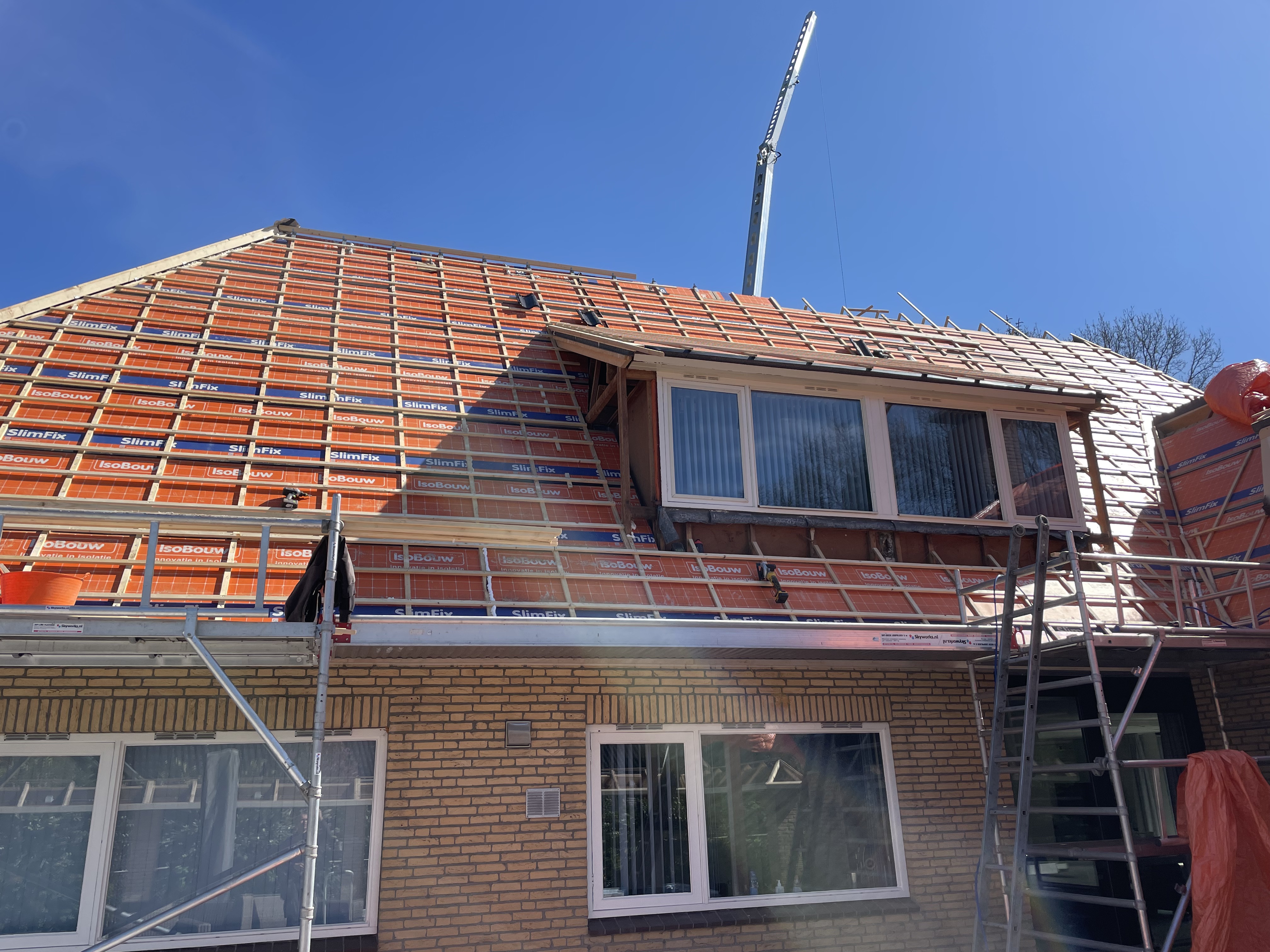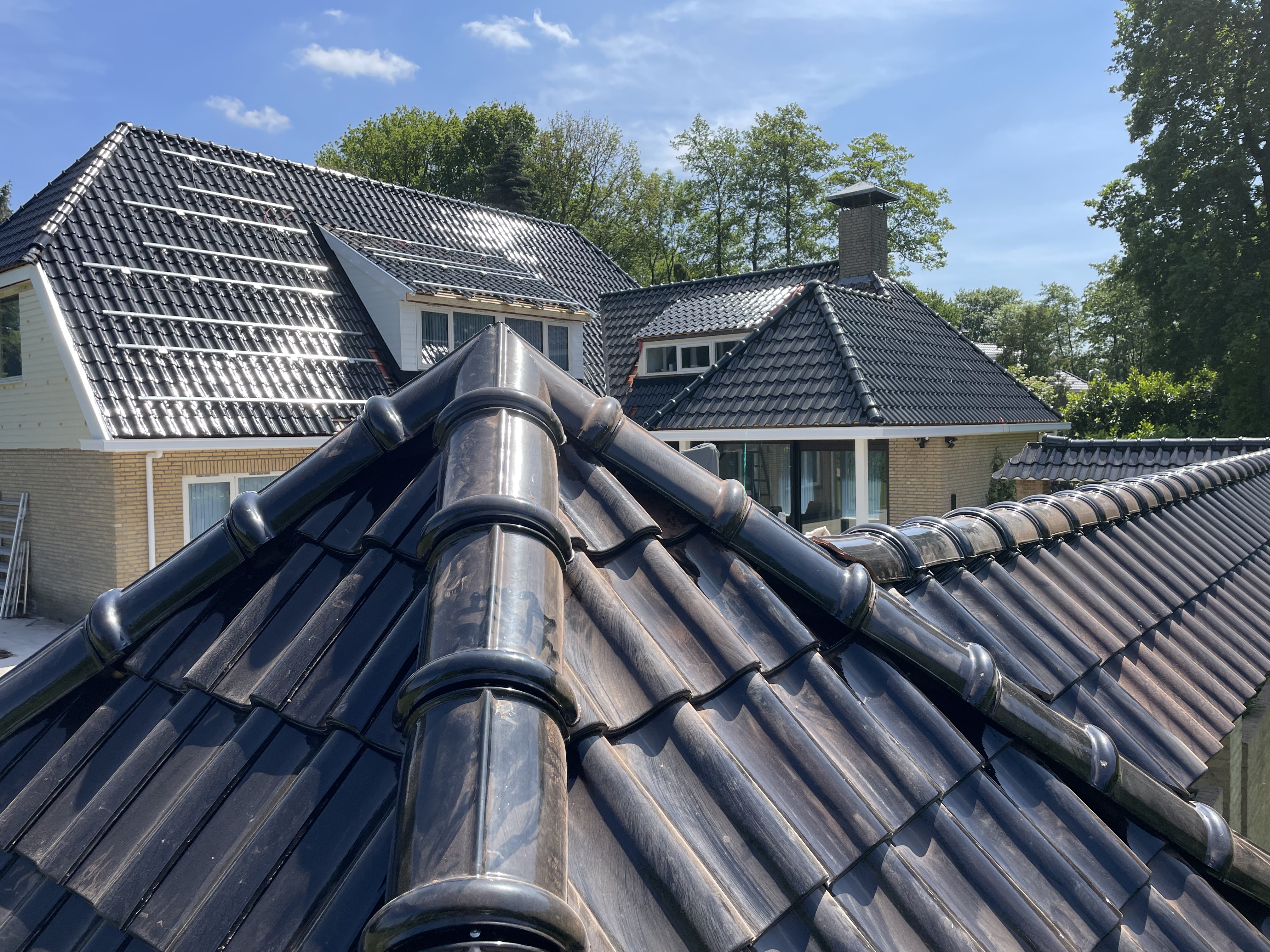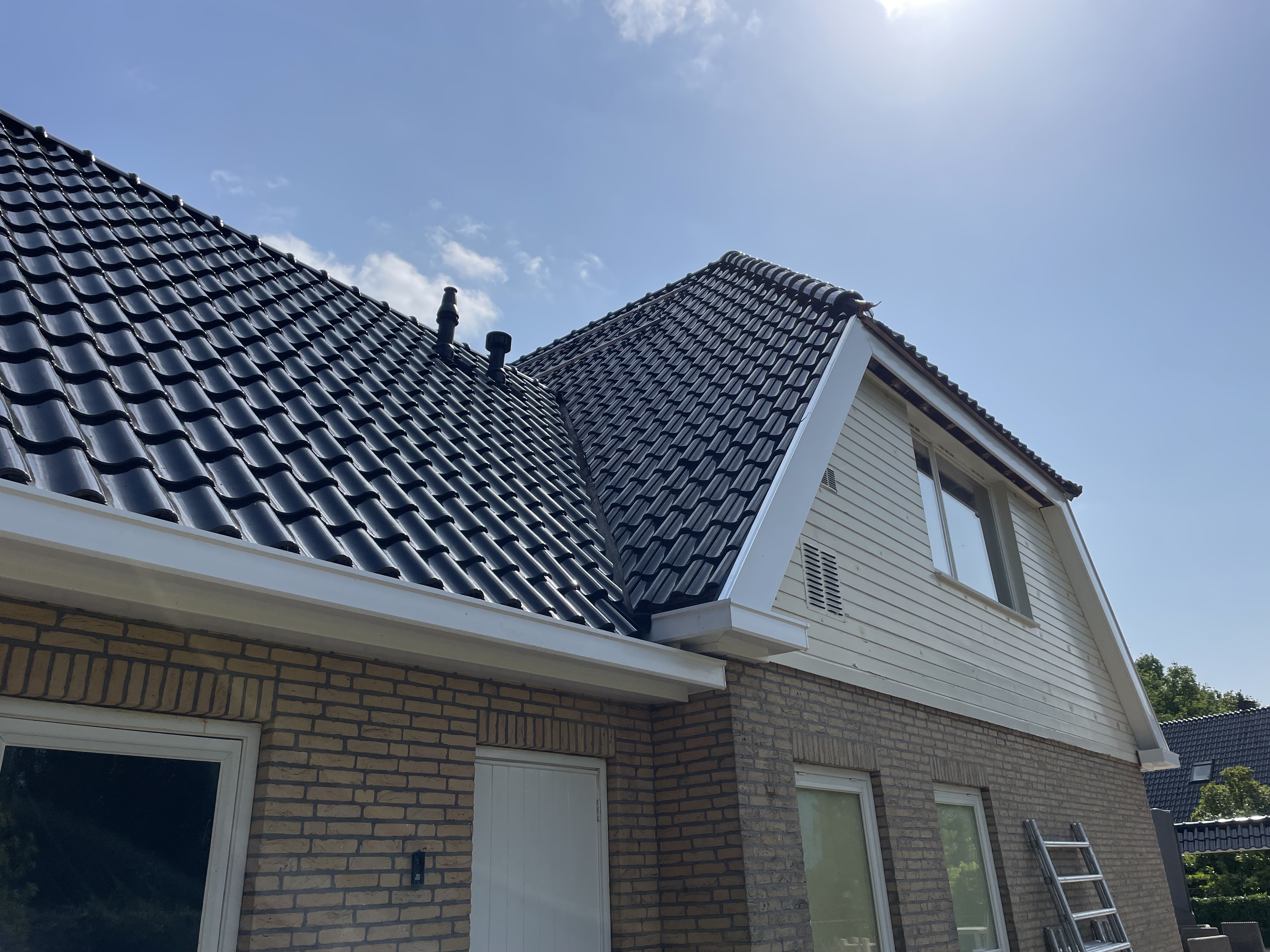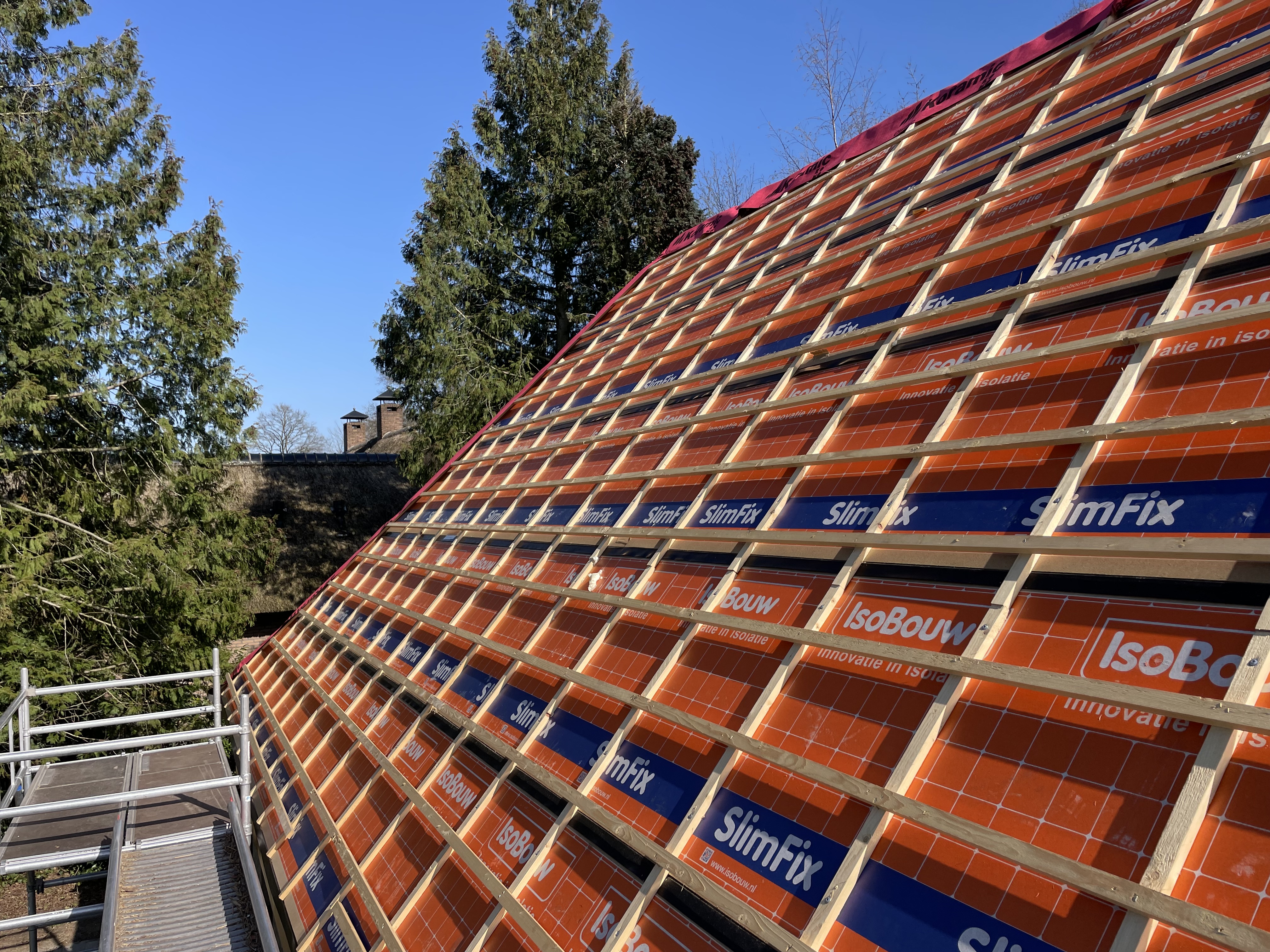 De eigenaar heeft ervoor gekozen het riet en asbest te laten saneren. Vervolgens is de sporenkap dak voorzien van Isobouw Slimfix spoor dakisolatieplaten. Alle dakkapellen zijn aangepast zodat er dakpannen op konden. De betimmering is van keralit sponningdelen en de dakgoten rondom zijn kunststof dakgoten van Polytech. Voor de dakpannen is gekozen voor Monier Nieuwe Hollander gitzwart verglaasd.
