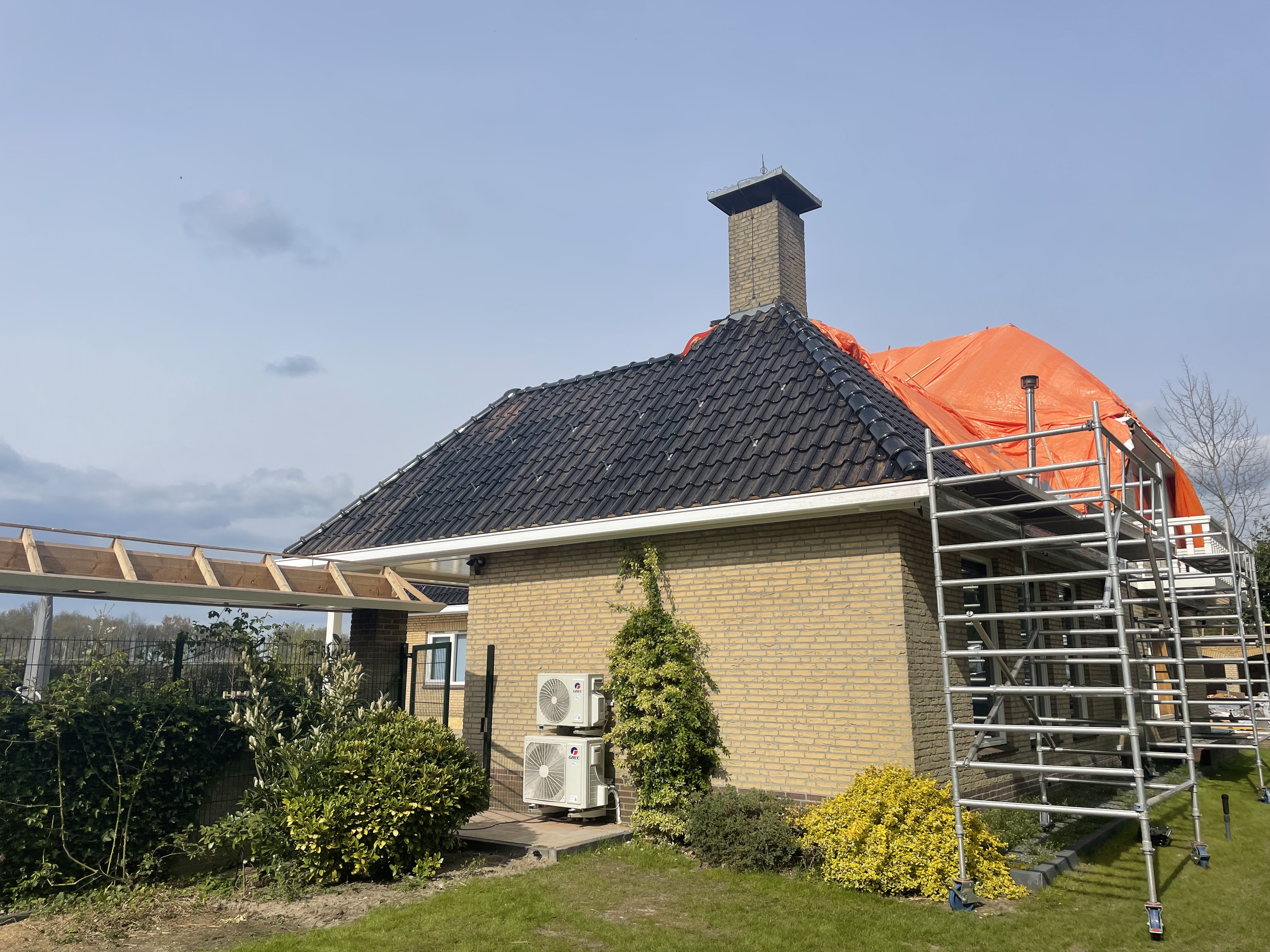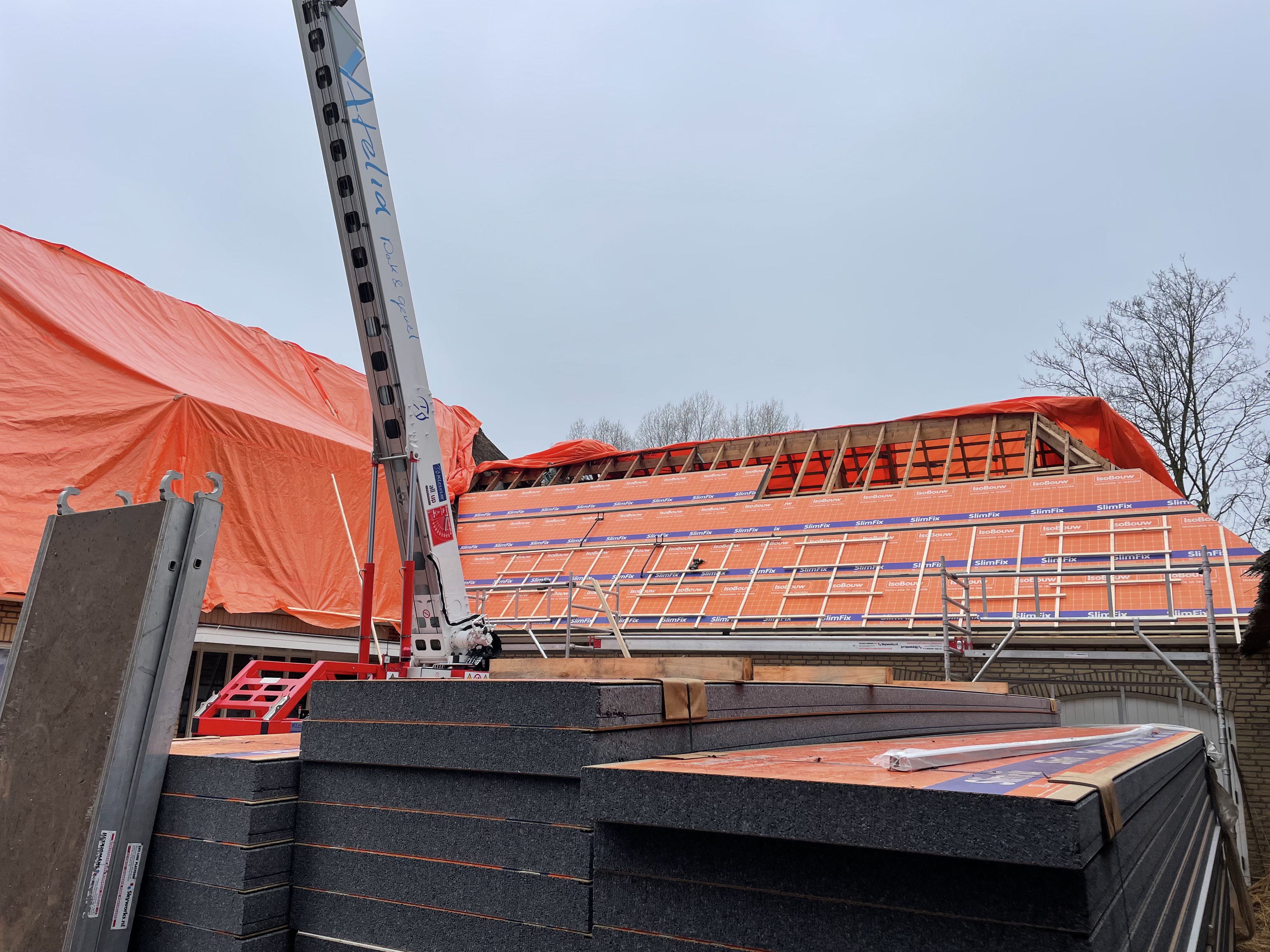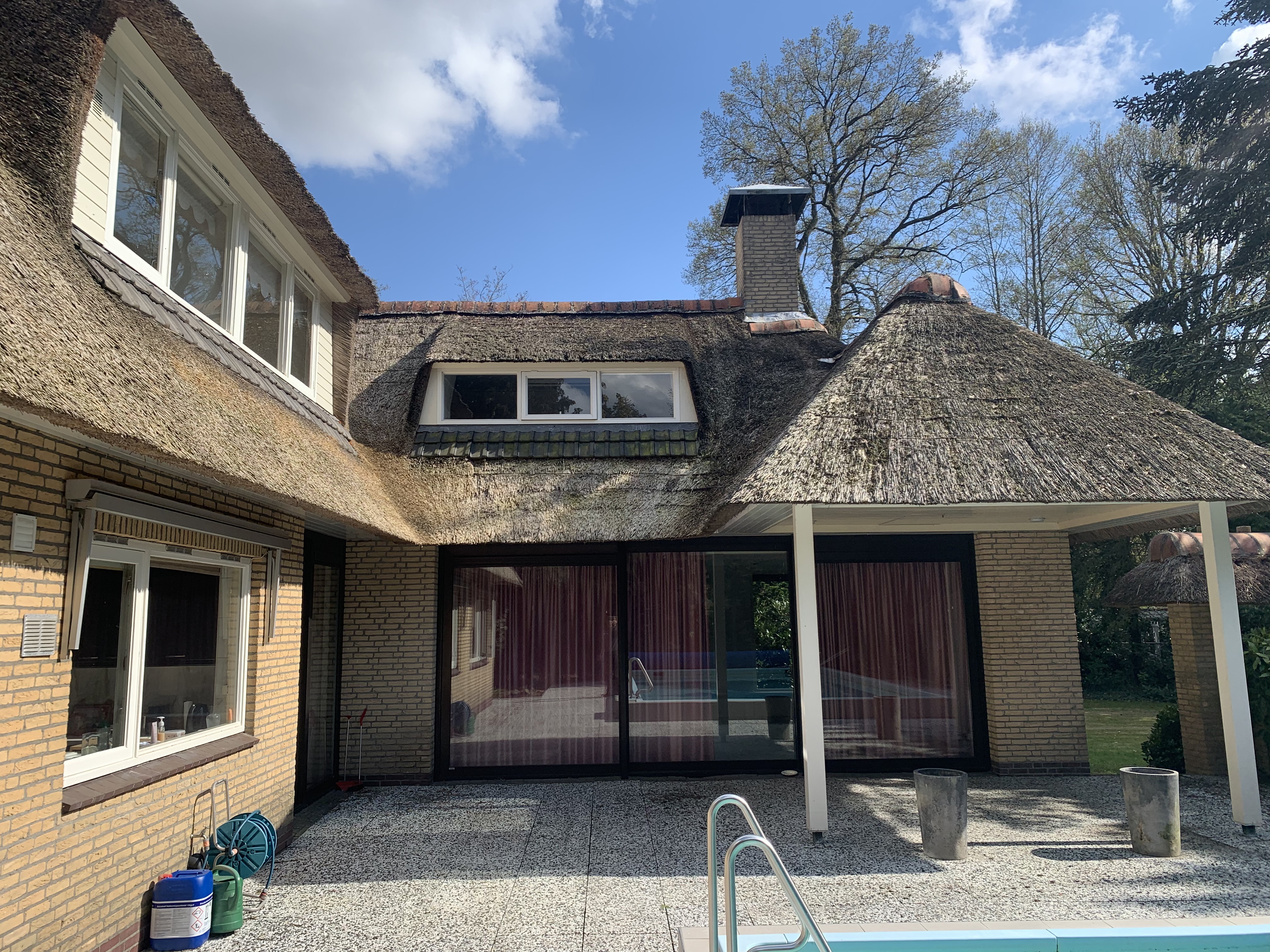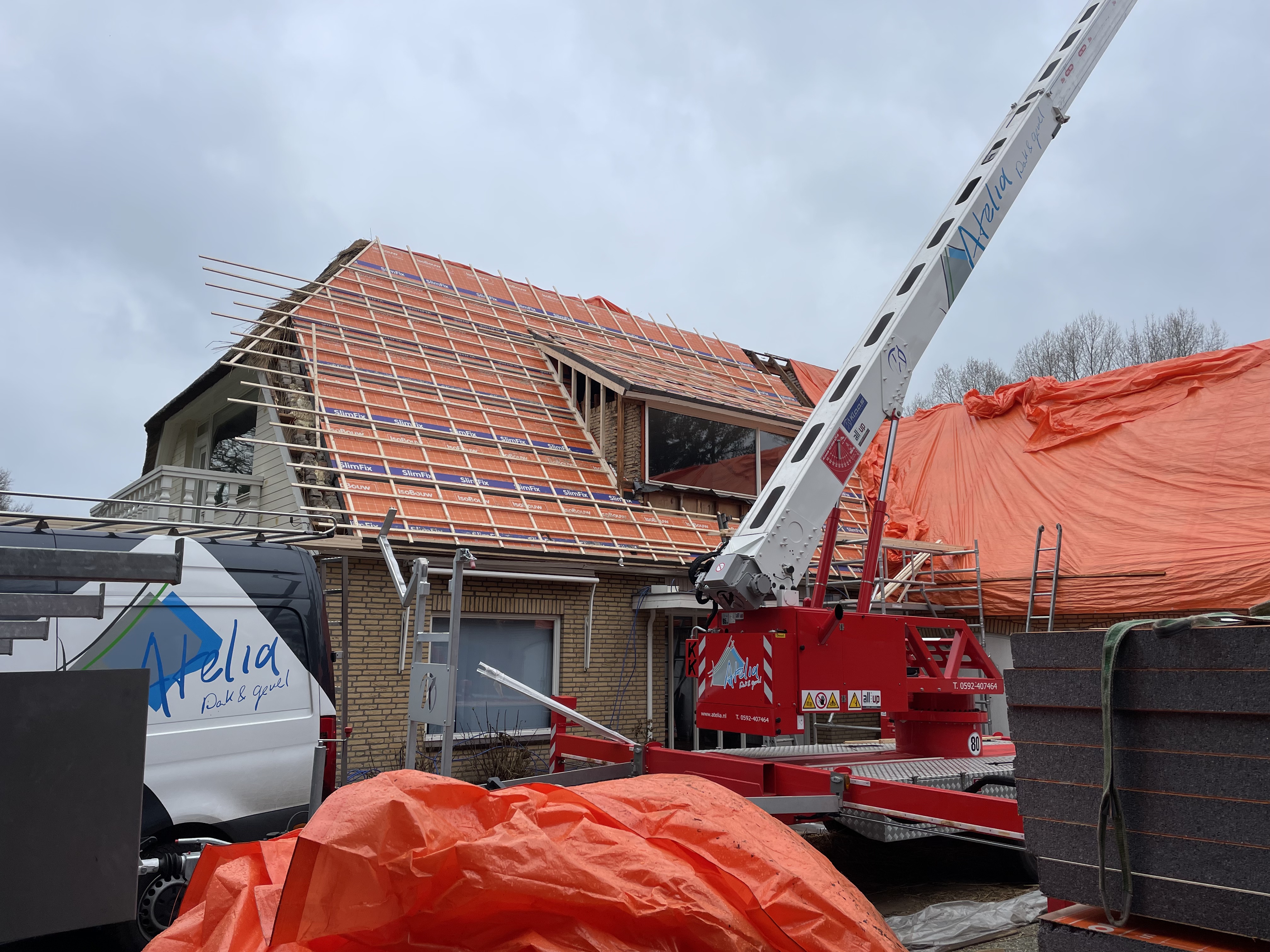 De eigenaar heeft ervoor gekozen het riet en asbest te laten saneren. Vervolgens is de sporenkap dak voorzien van Isobouw Slimfix spoor dakisolatieplaten. Alle dakkapellen zijn aangepast zodat er dakpannen op konden. De betimmering is van keralit sponningdelen en de dakgoten rondom zijn kunststof dakgoten van Polytech. Voor de dakpannen is gekozen voor Monier Nieuwe Hollander gitzwart verglaasd.