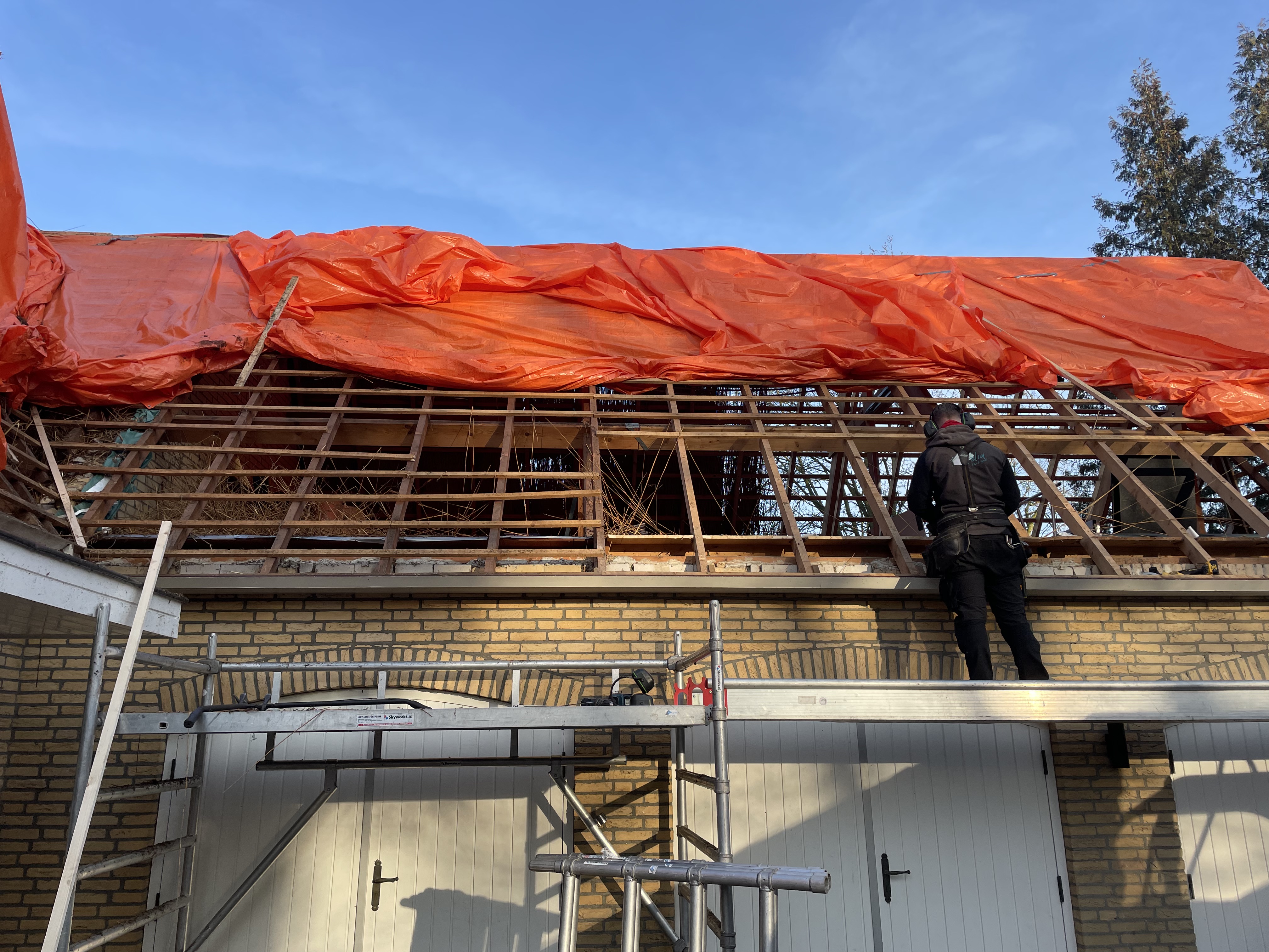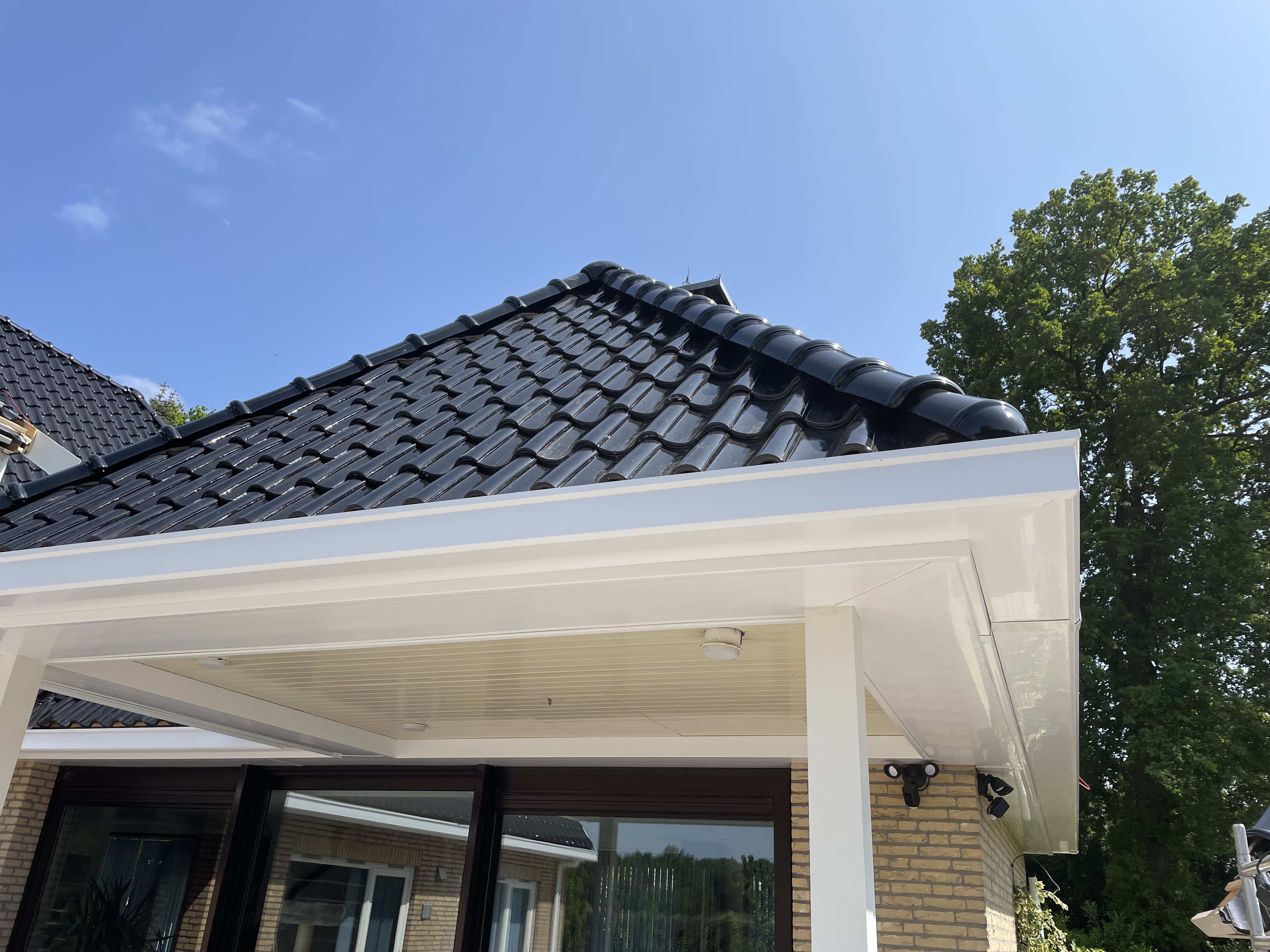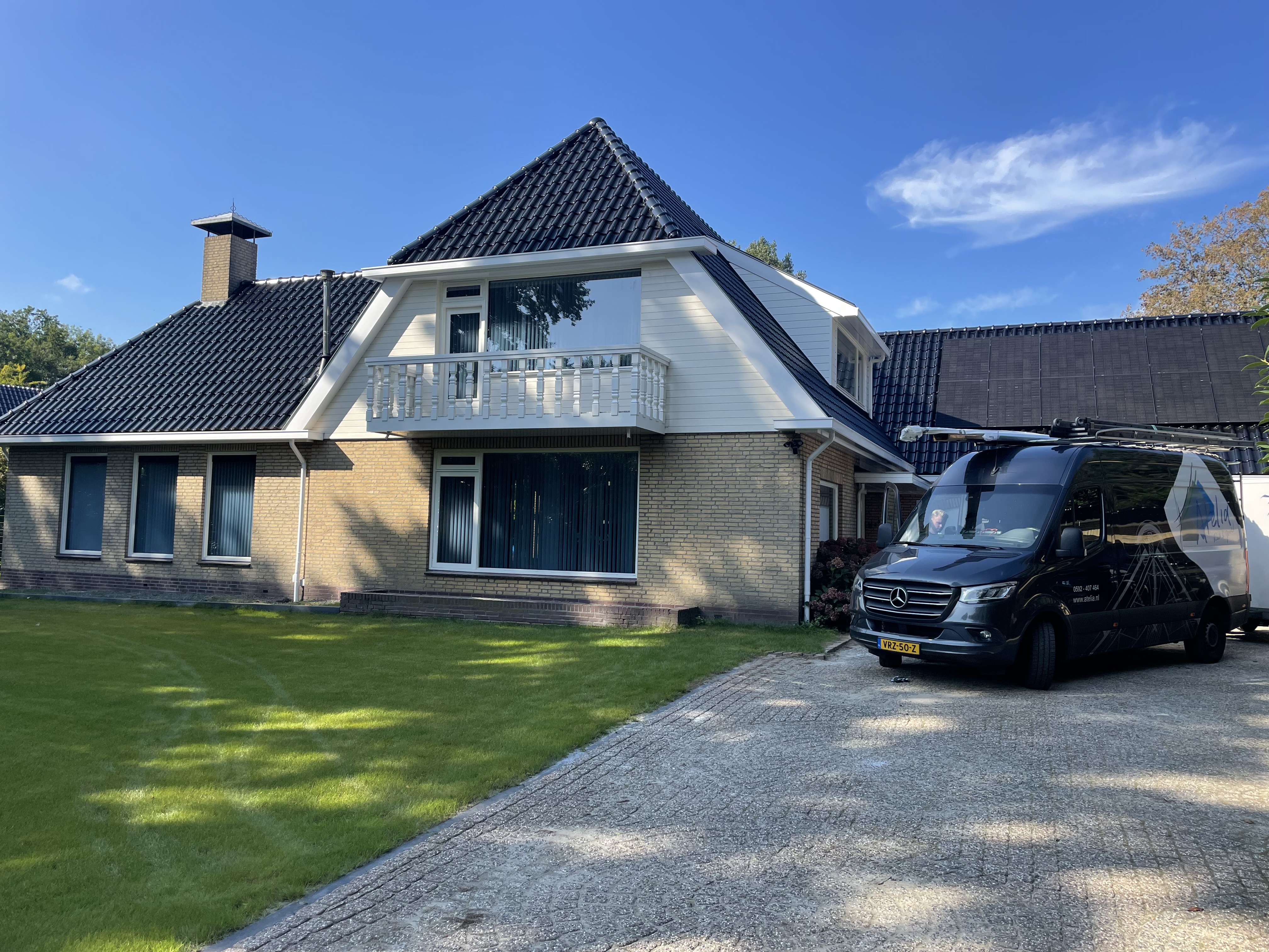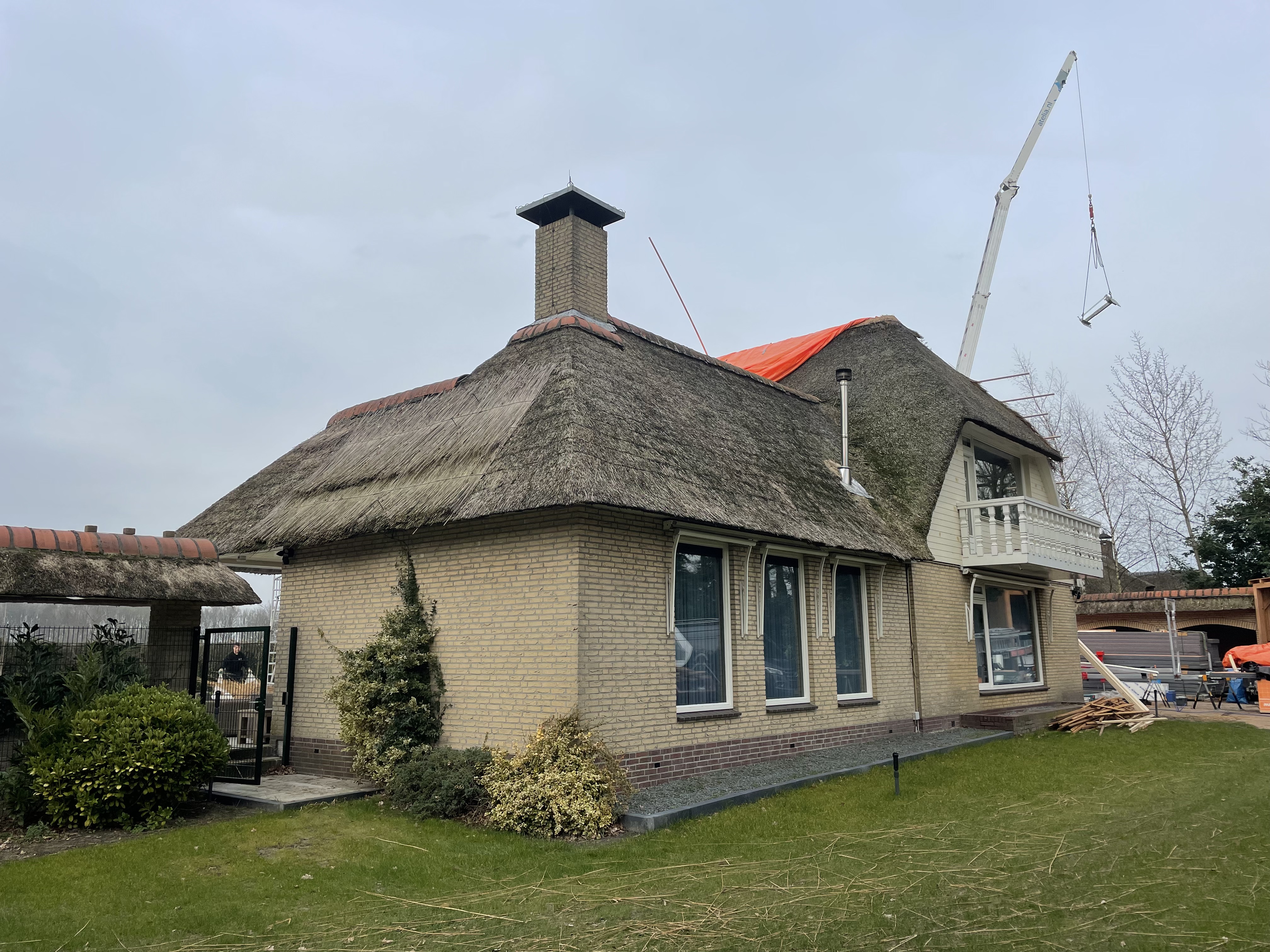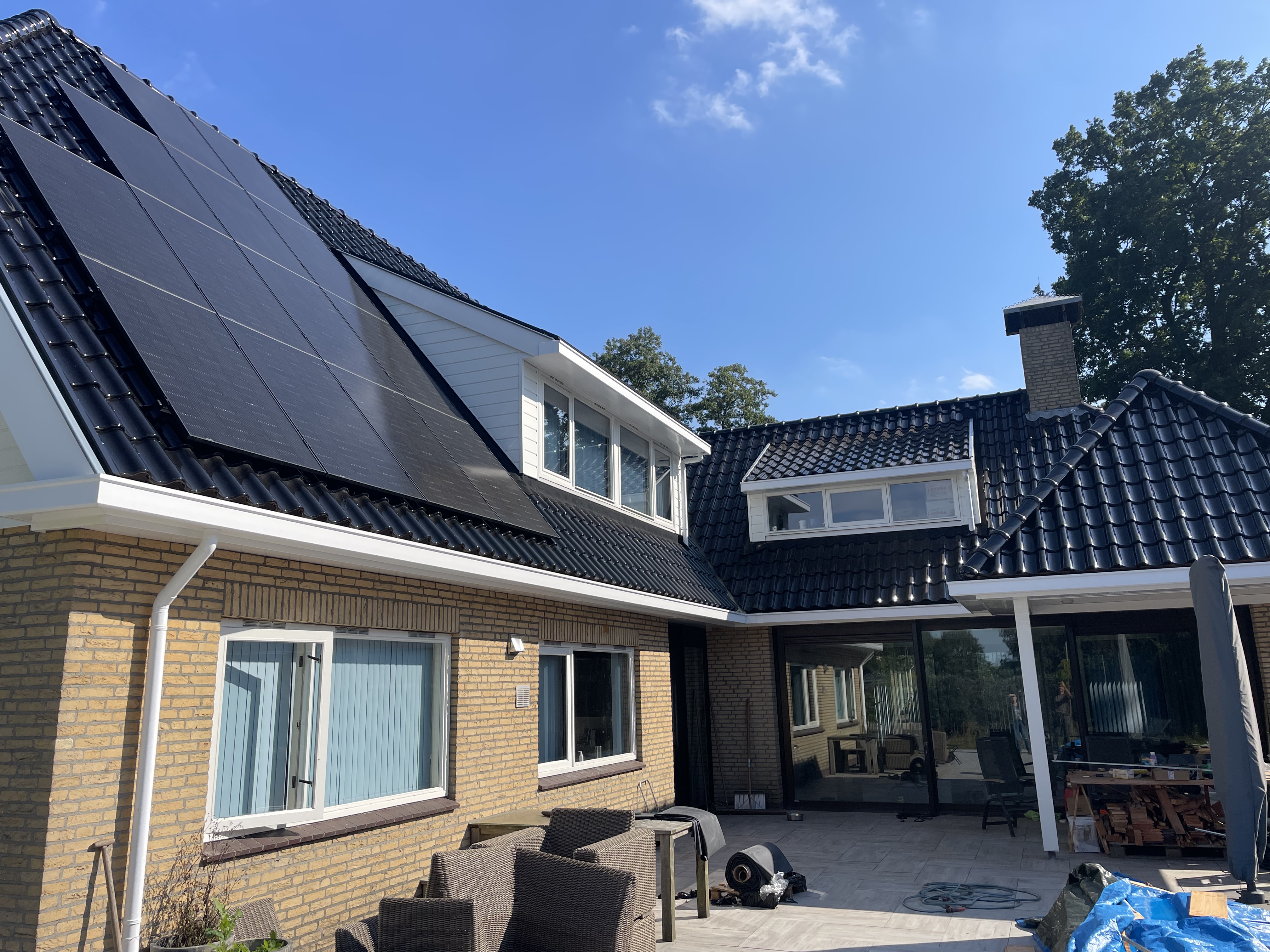 De eigenaar heeft ervoor gekozen het riet en asbest te laten saneren. Vervolgens is de sporenkap dak voorzien van Isobouw Slimfix spoor dakisolatieplaten. Alle dakkapellen zijn aangepast zodat er dakpannen op konden. De betimmering is van keralit sponningdelen en de dakgoten rondom zijn kunststof dakgoten van Polytech. Voor de dakpannen is gekozen voor Monier Nieuwe Hollander gitzwart verglaasd.