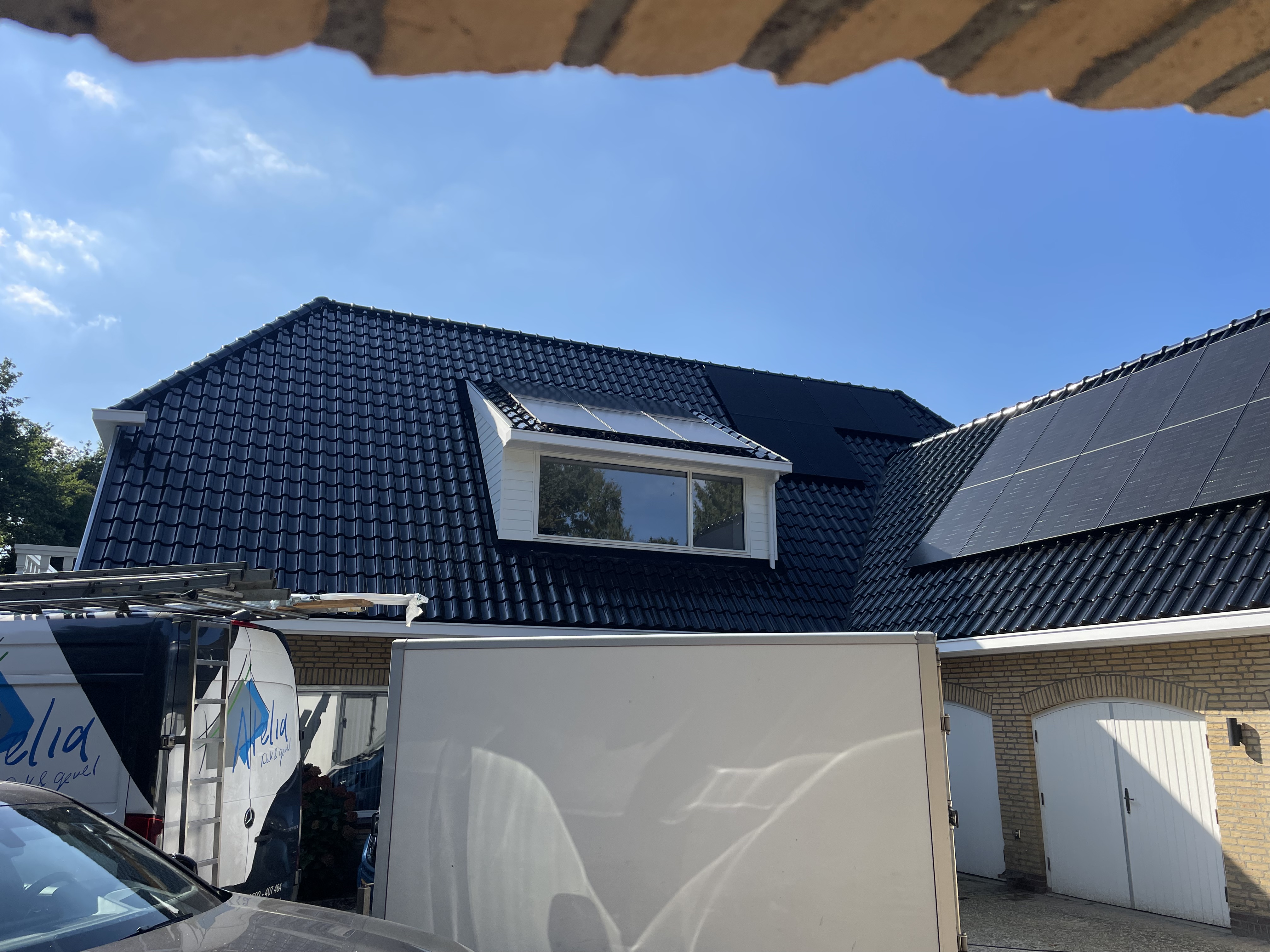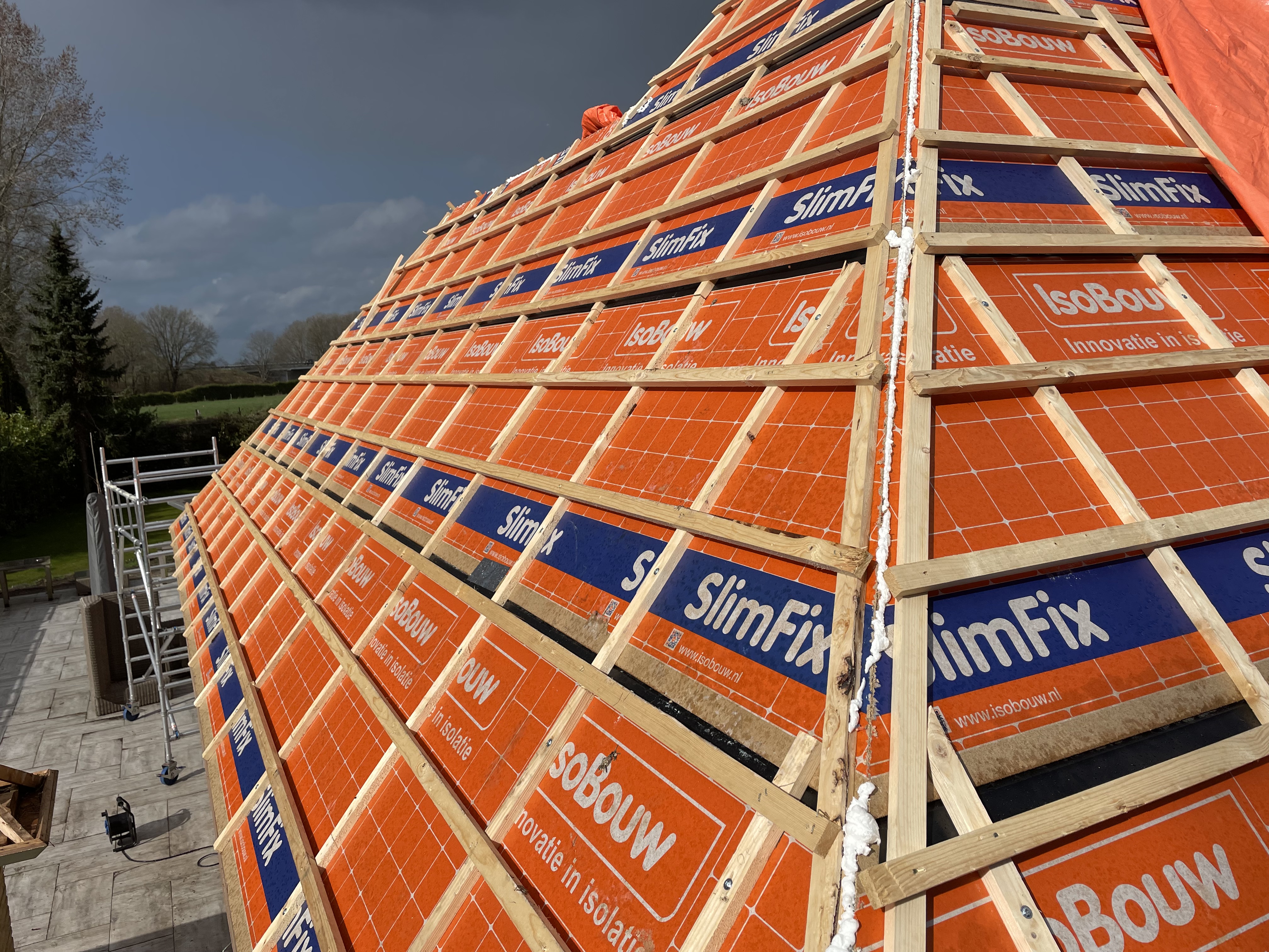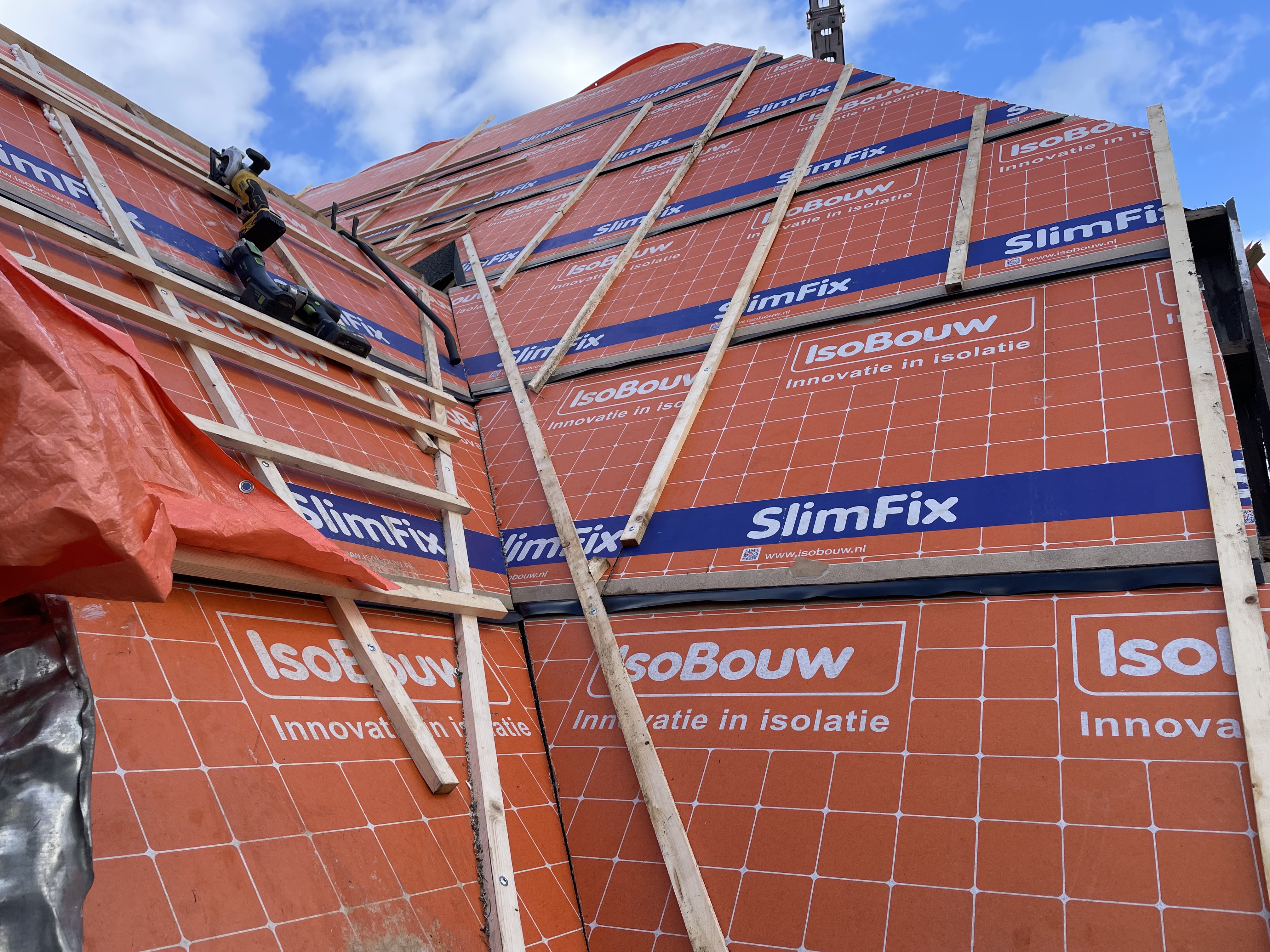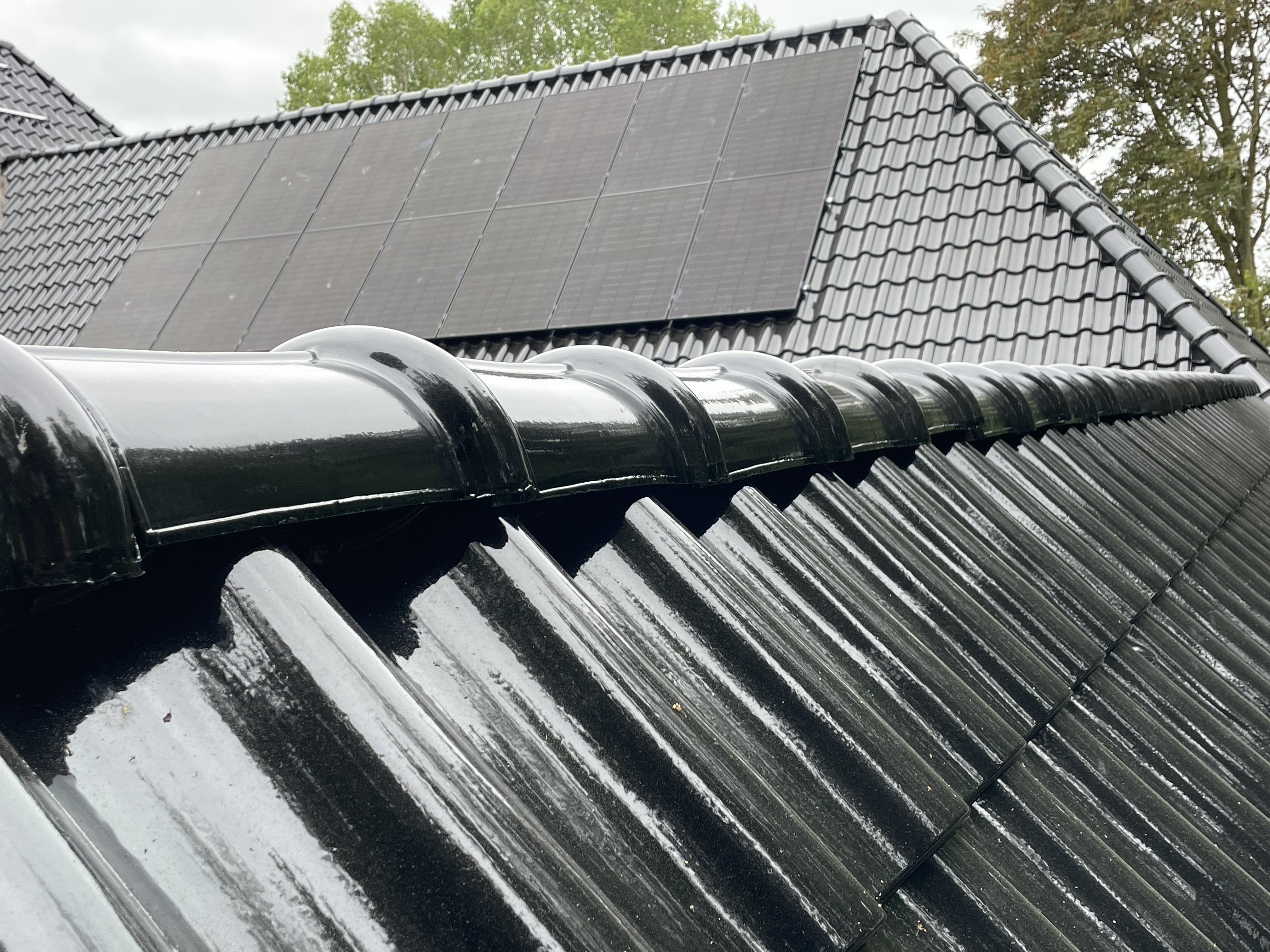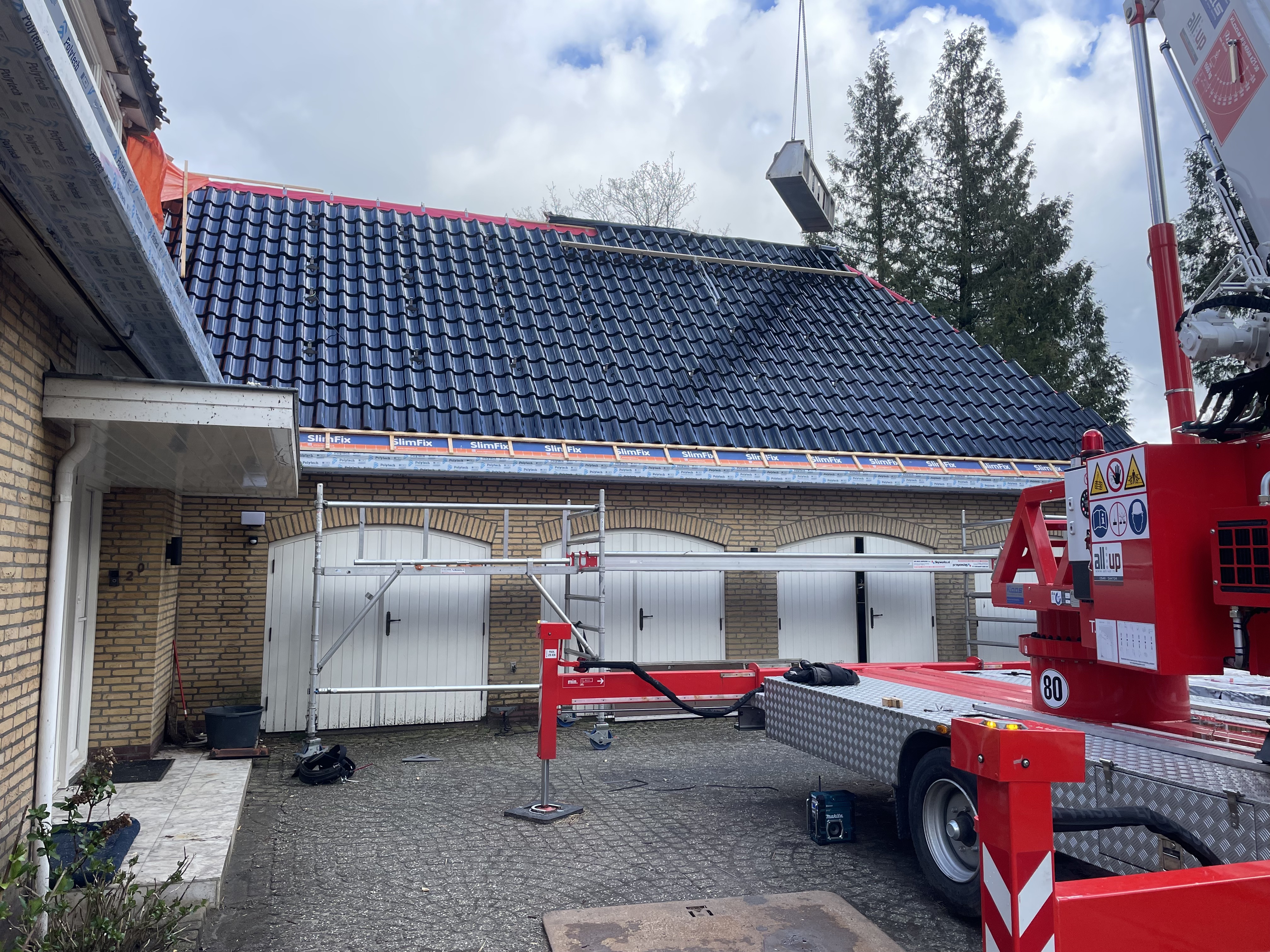 De eigenaar heeft ervoor gekozen het riet en asbest te laten saneren. Vervolgens is de sporenkap dak voorzien van Isobouw Slimfix spoor dakisolatieplaten. Alle dakkapellen zijn aangepast zodat er dakpannen op konden. De betimmering is van keralit sponningdelen en de dakgoten rondom zijn kunststof dakgoten van Polytech. Voor de dakpannen is gekozen voor Monier Nieuwe Hollander gitzwart verglaasd.